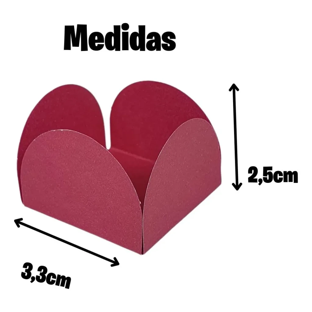 - Medidas da forminha montada: 2,5cm x 3,3cm x 3,3cm (Altura x Largura x Comprimento)