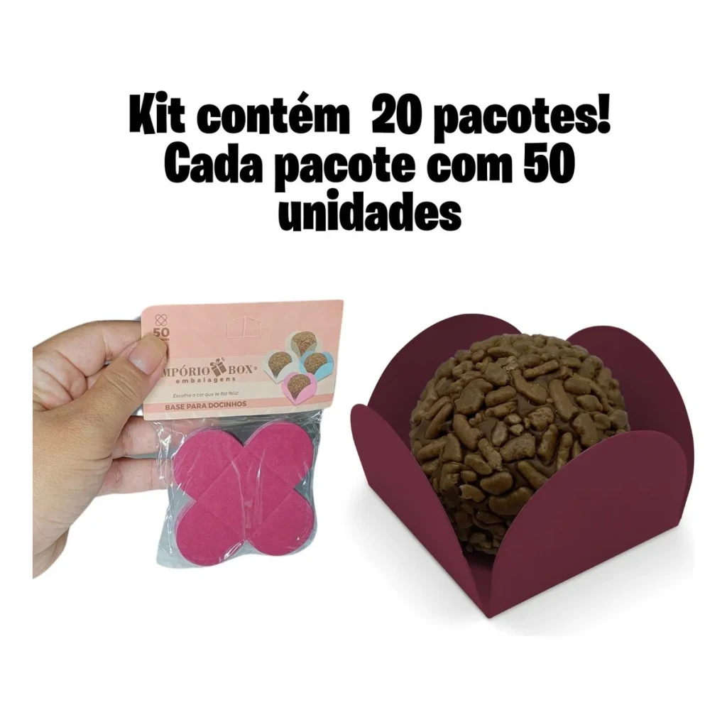 O kit contém 1.000 forminhas na cor que você desejar, dividido em 20 pacotes com 50 unidades cada.