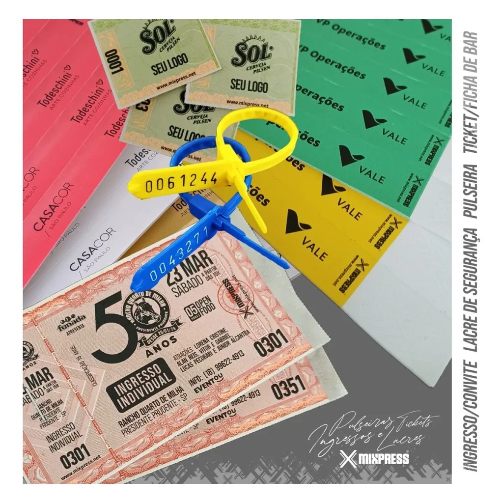 Trabalhamos com pulseiras, tickets e ingressos personalizados, além dos melhores lacres do mercado, fabricados em polipropileno atóxico e formato escadinha.