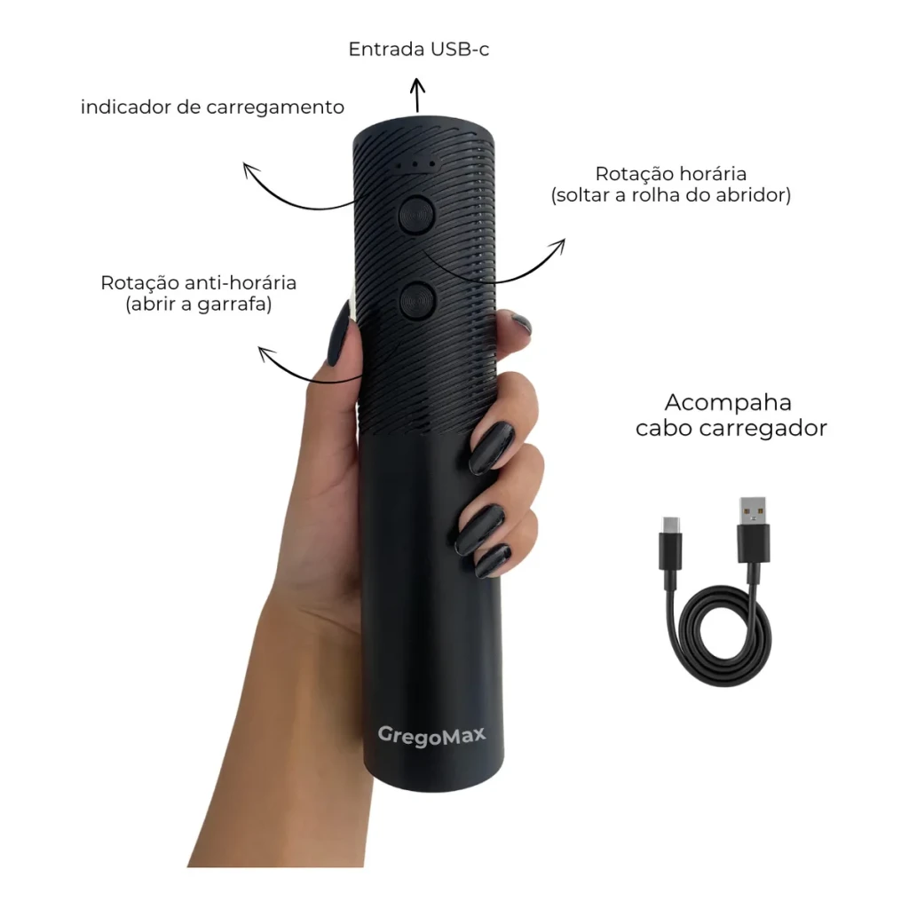 Desfrute da praticidade do Abridor de Vinhos Elétrico GregoMax. Com design ergonômico e recarregável via USB, ele remove rolhas em segundos.
