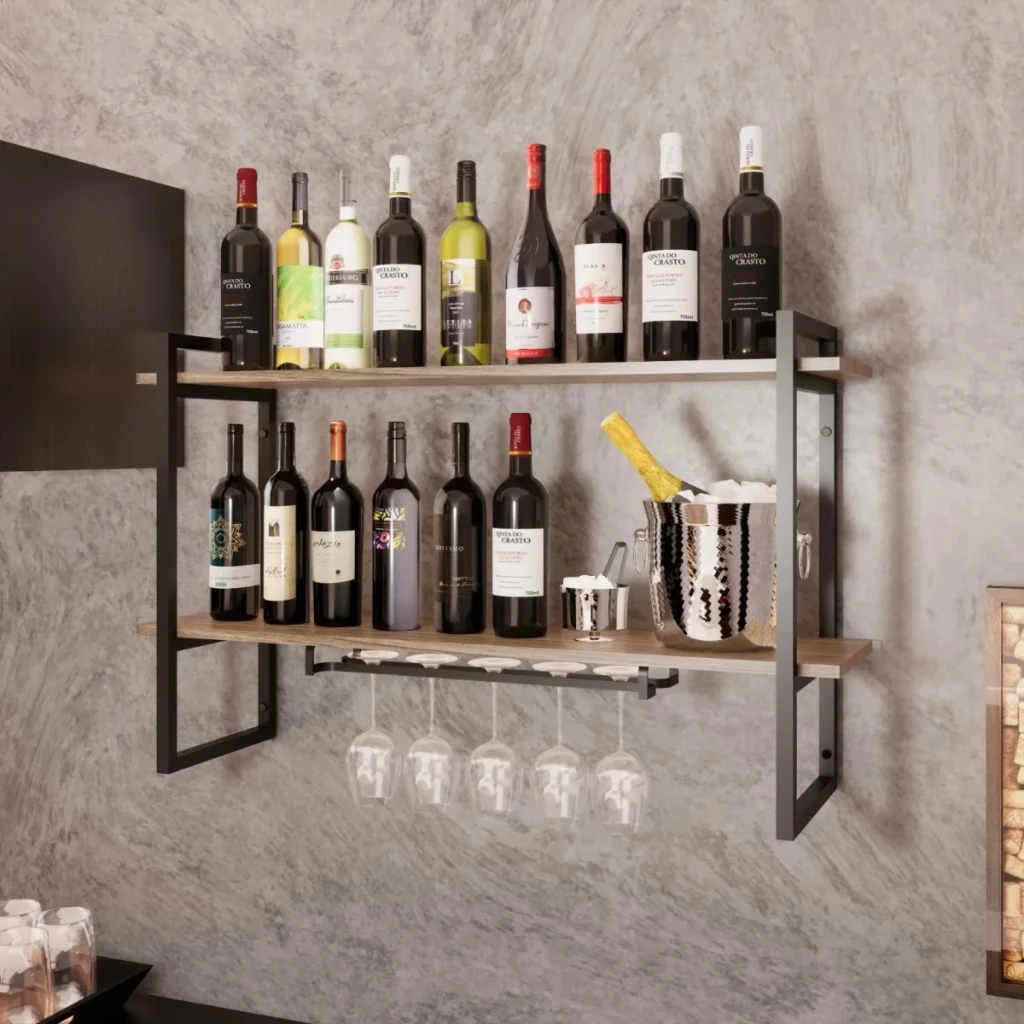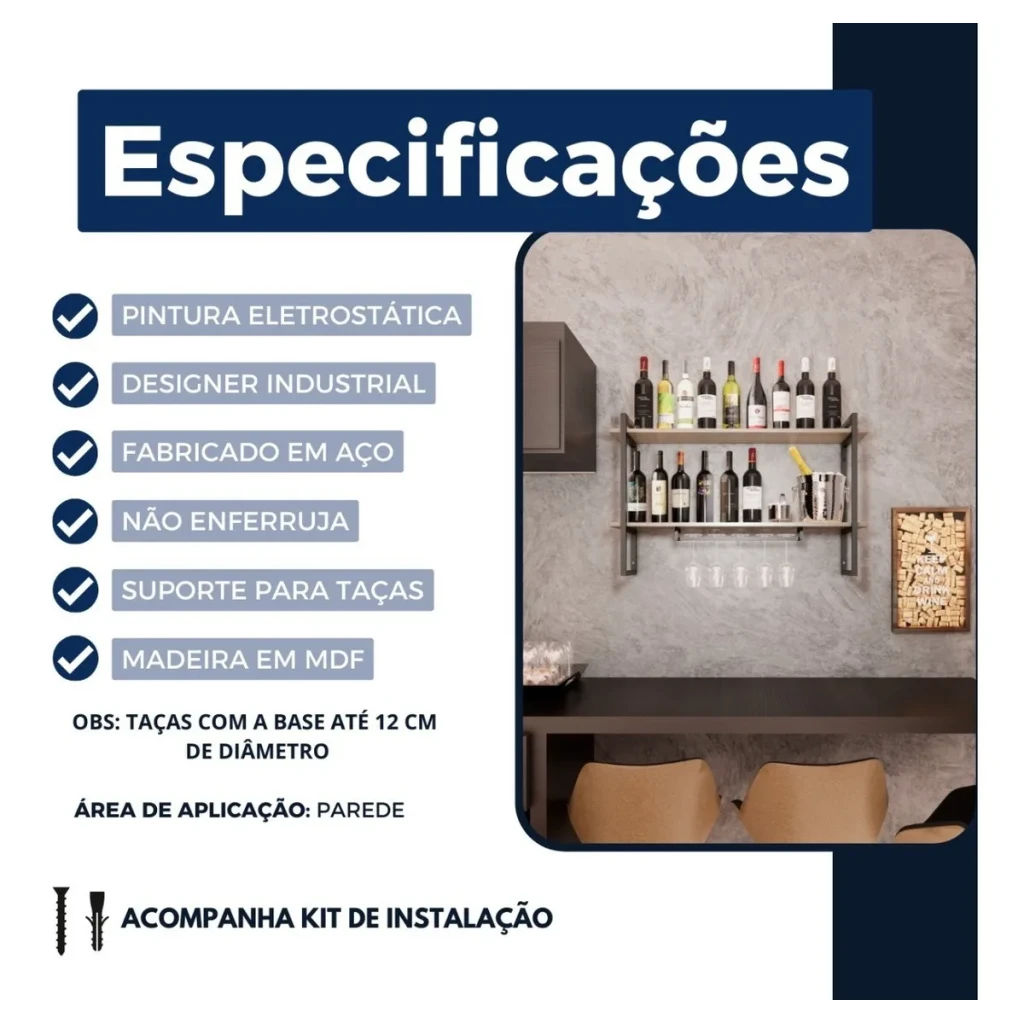 Transforme seu espaço com a elegância da Adega Bar Industrial, perfeita para armazenar e exibir suas bebidas favoritas. Com prateleiras duplas e suporte para taças, este móvel de parede combina funcionalidade e design sofisticado.