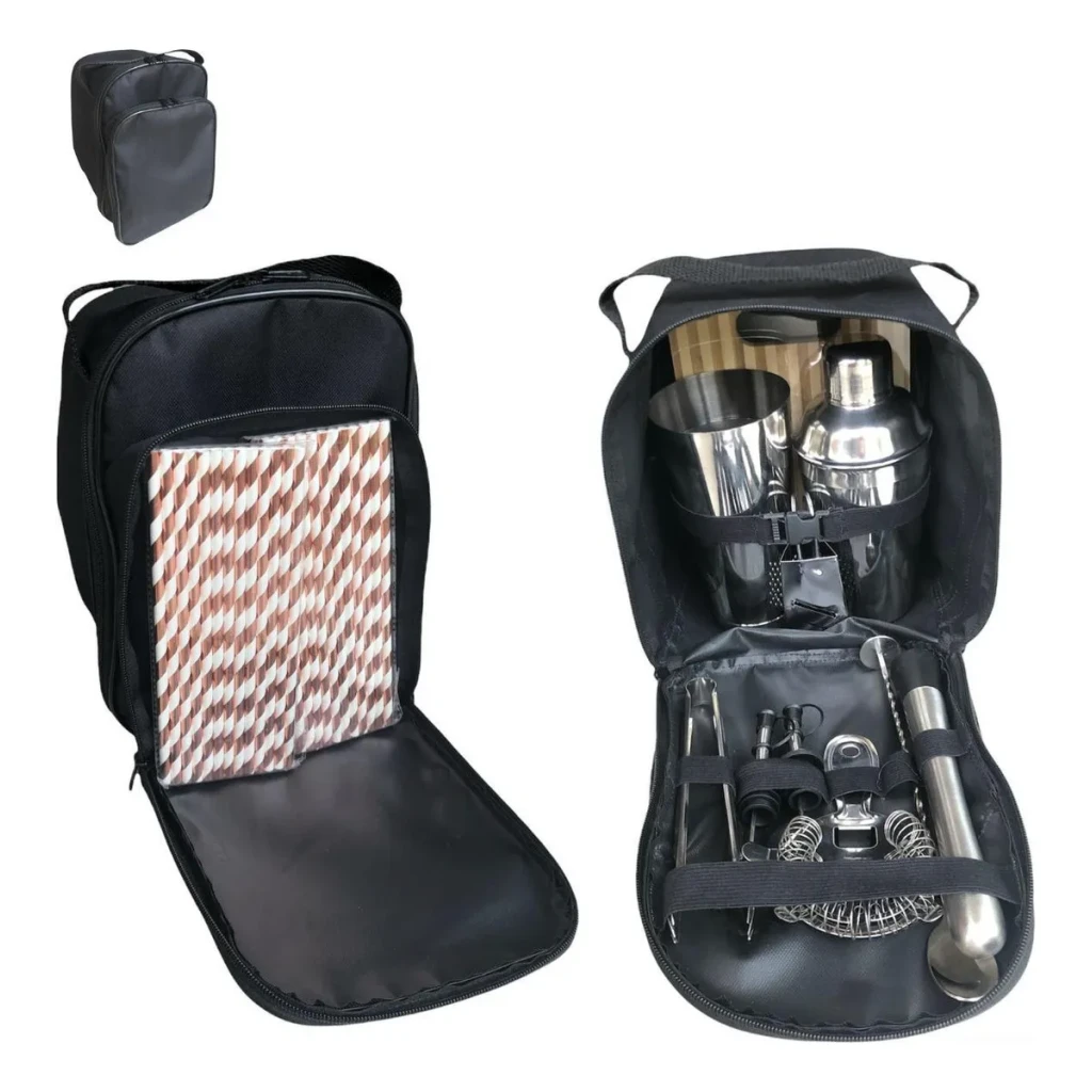 - Organização Eficiente: Duas divisões internas para armazenar coqueteleiras, colheres, strainers e mais.