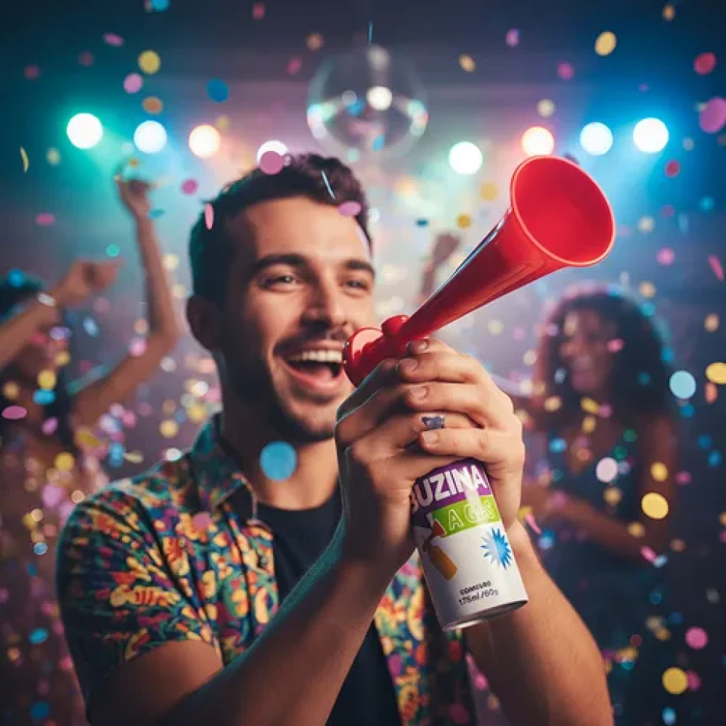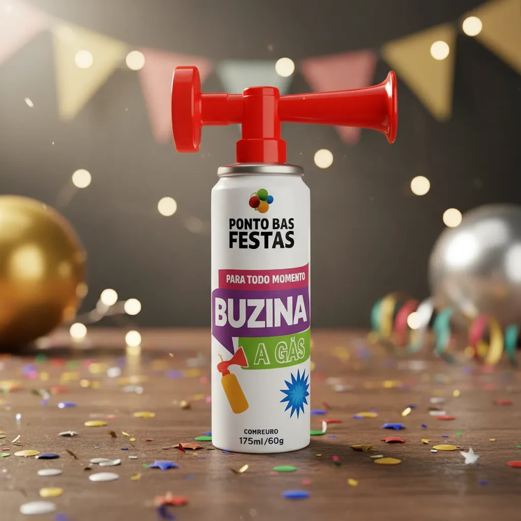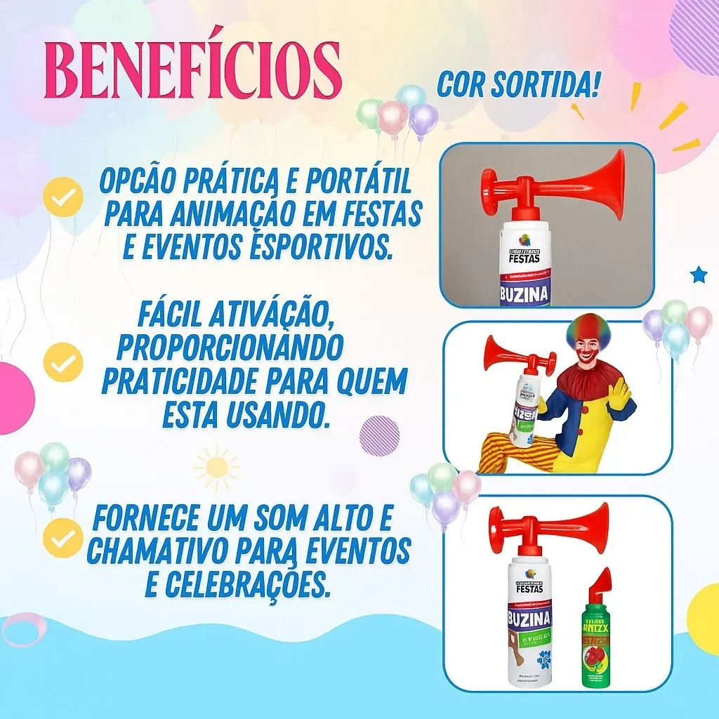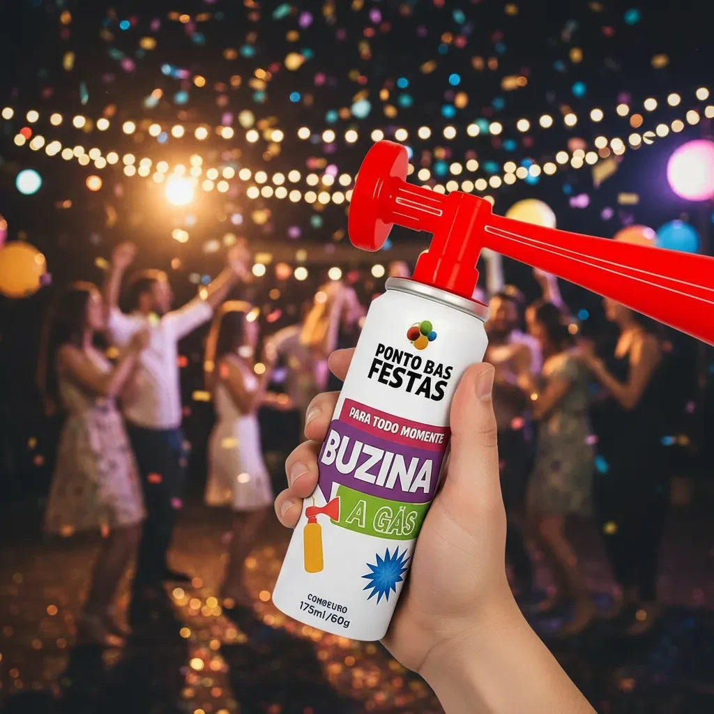 Adicione mais animação às suas festas com esta buzina de ar comprimido que produz um som vibrante e divertido, perfeito para comemorações e momentos de descontração.