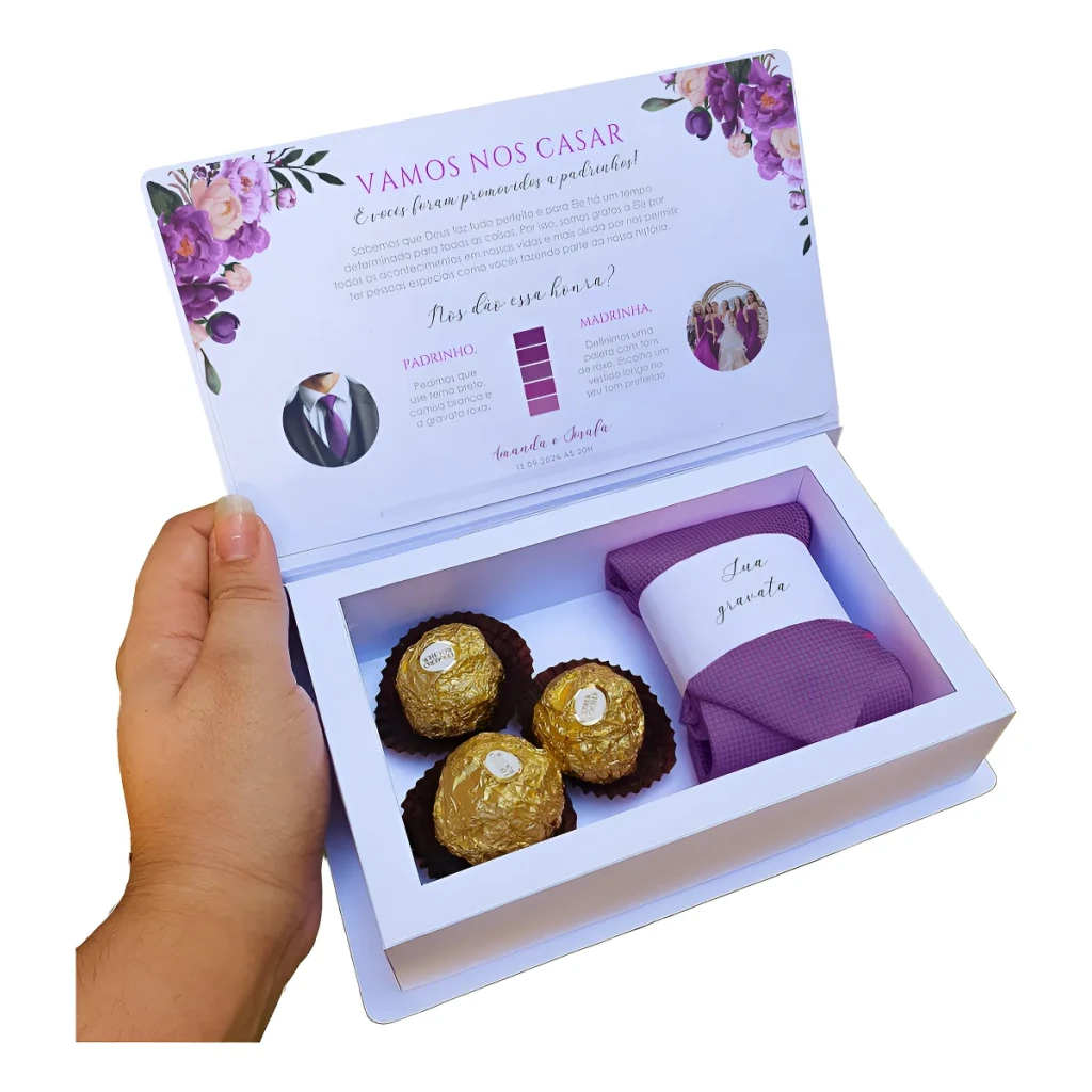 Transforme seu casamento em um momento inesquecível com nossas caixas convites personalizadas para padrinhos. Feitas com papel offset de alta qualidade, são ideais para diversas ocasiões.