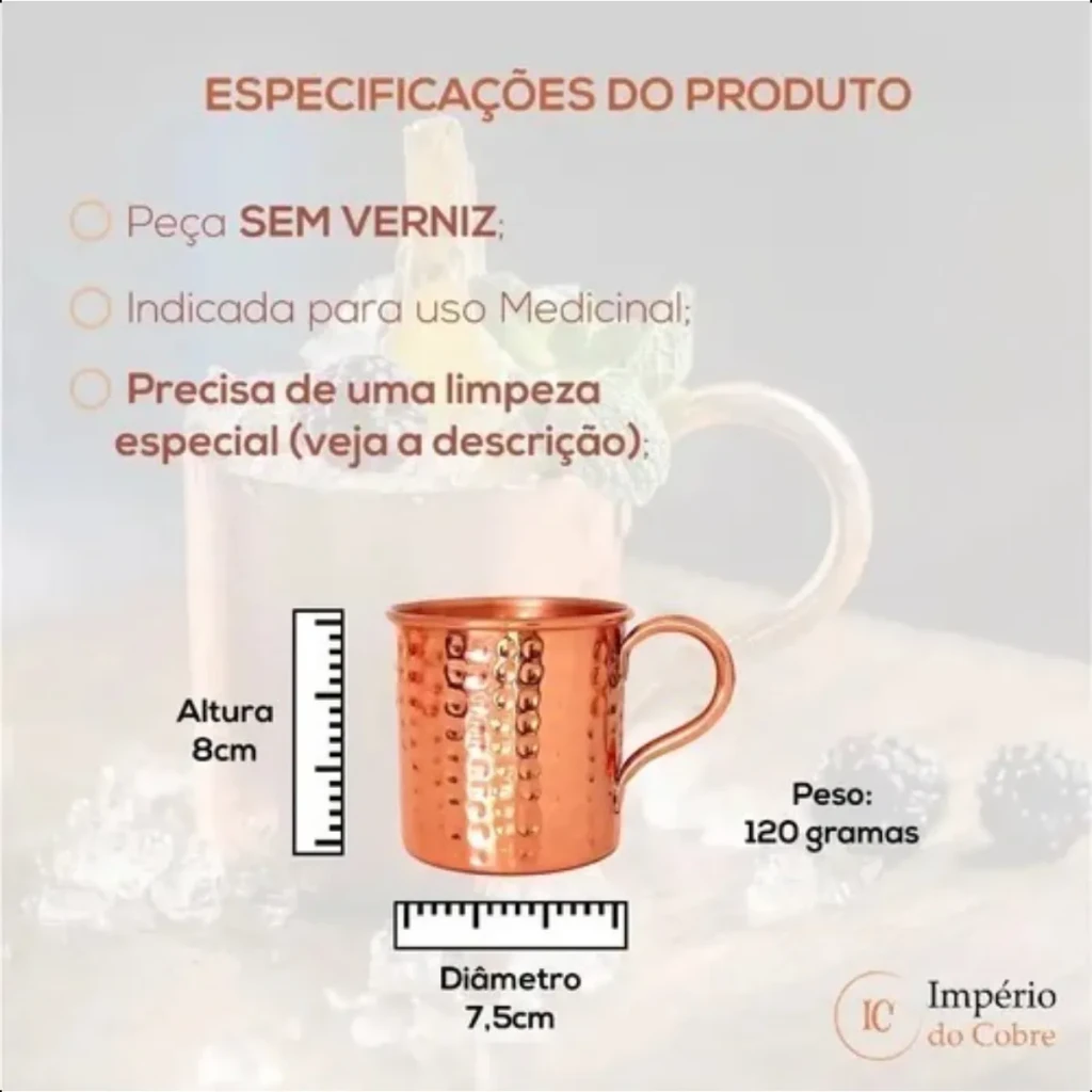 Capacidade em volume: 350 mL.; É fabricado em cobre.; Inclui canecas.; É à prova de vazamentos.