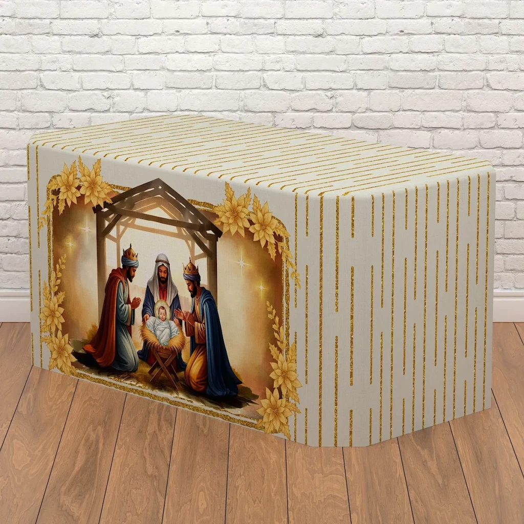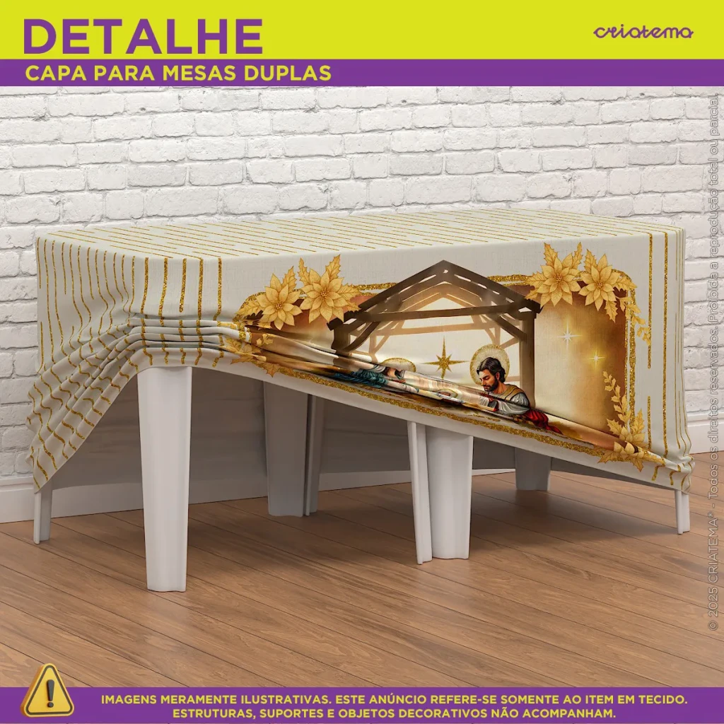 Adicione um toque especial à sua festa de Natal com nossa Capa de Mesa em Tecido. Com design exclusivo e prático, ela se ajusta facilmente às mesas.