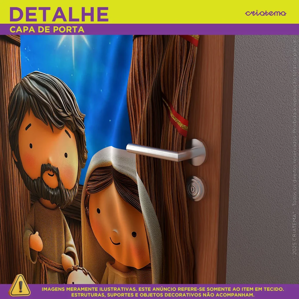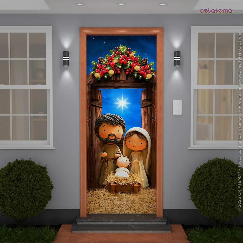 Transforme sua decoração natalina com nossa Capa de Porta Decorativa em malha, com arte exclusiva do Menino Jesus. Medindo 0,85×2,10m, ela se adapta facilmente à sua porta.