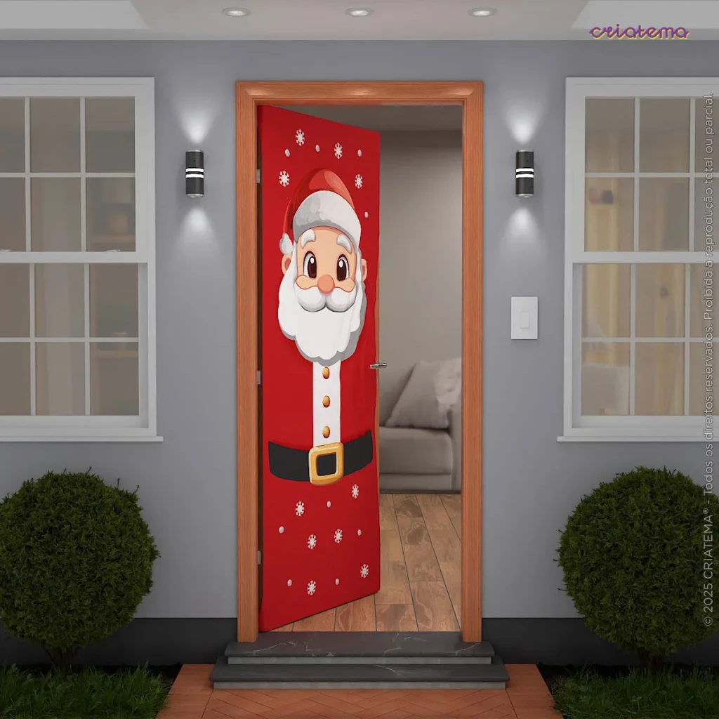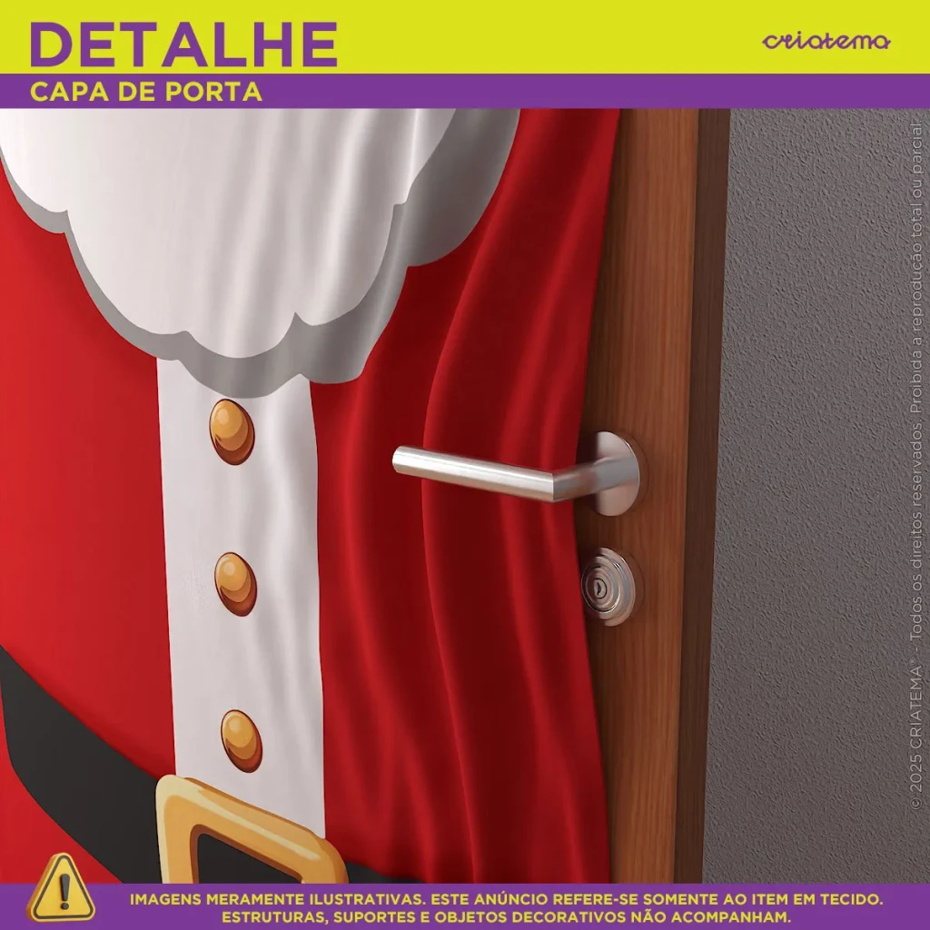 A Capa de Porta Natalina Decorativa Papai Noel é feita em tecido malha, proporcionando praticidade e um visual encantador para suas festas. Com um tamanho ideal de 0,85×2,10m, ela é perfeita para portas com dimensões máximas de 0,80×2,10m.