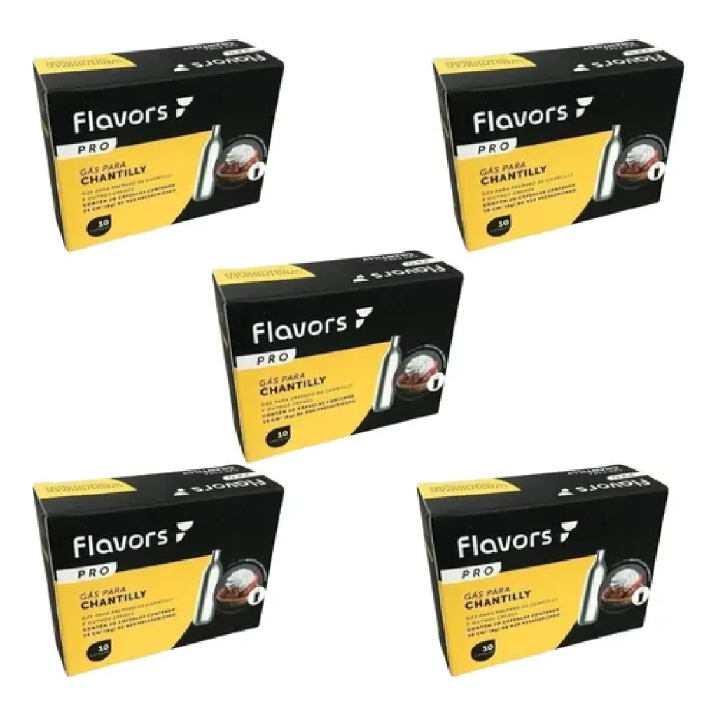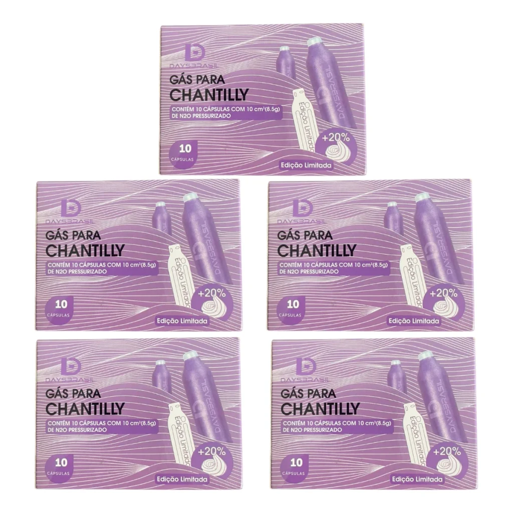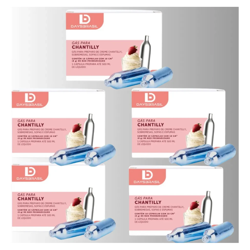 Este kit contém 5 caixas com 10 cápsulas cada, totalizando 50 ampolas de gás N2O, perfeito para preparar chantilly, espumas e mais.