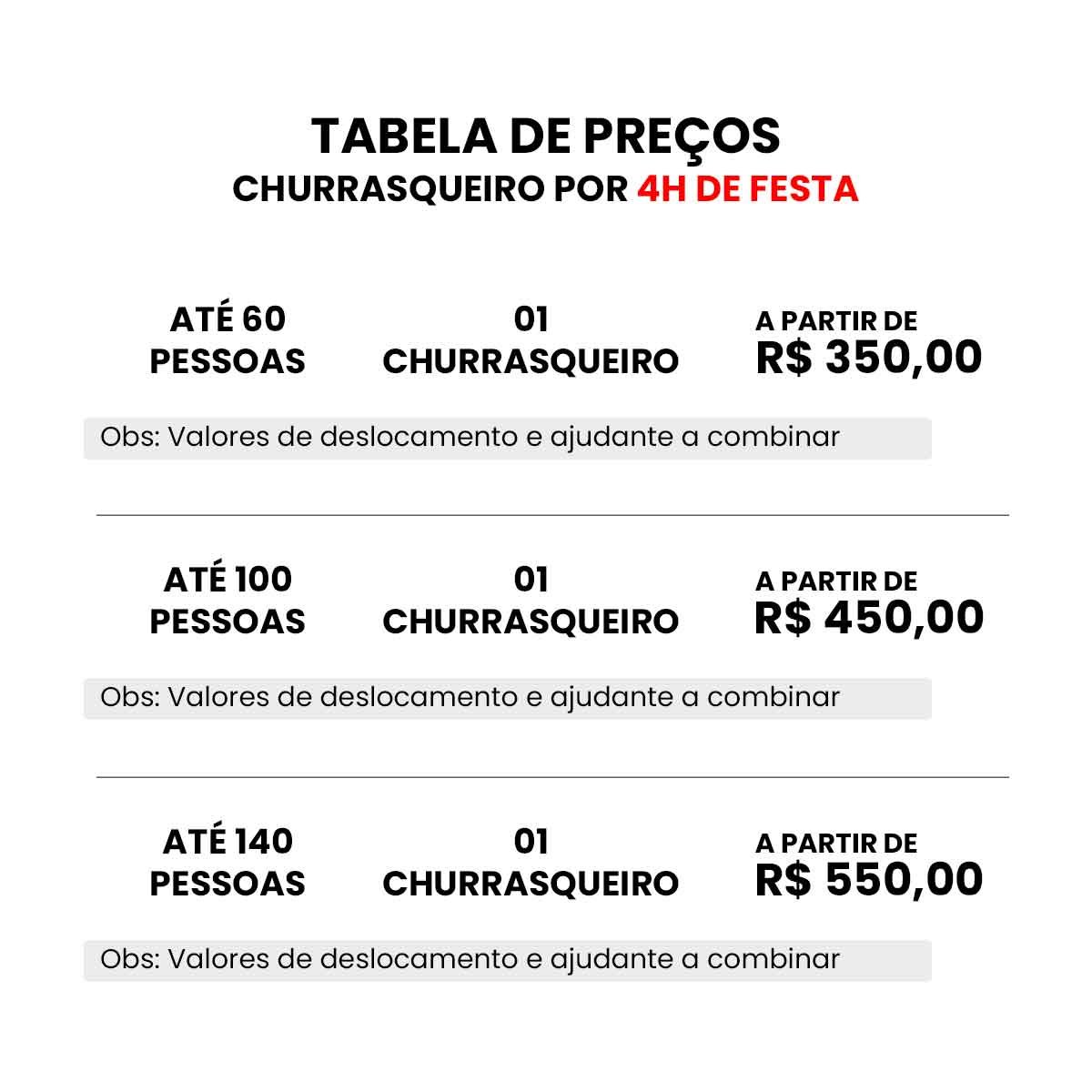 Mão de obra de churrasqueiro para festa a domicílio com serviço padrão de 4 horas e valores calculados conforme sua lista de convidados. Deslocamento e ajudantes a combinar. Garanta sua data e transforme seu evento!