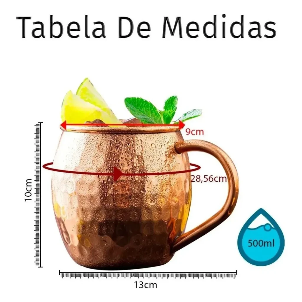 Este conjunto contém 4 canecas tipo Moscow Mule, cada uma com capacidade de 500ml, ideal para desfrutar de drinks refrescantes.