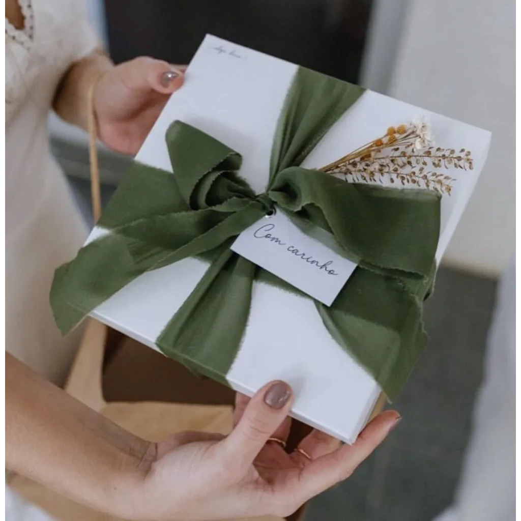 Para um acabamento elegante, combine a fita rústica com flores de sempre-viva. Essa combinação traz um charme adicional para suas caixas de padrinhos e convites.
