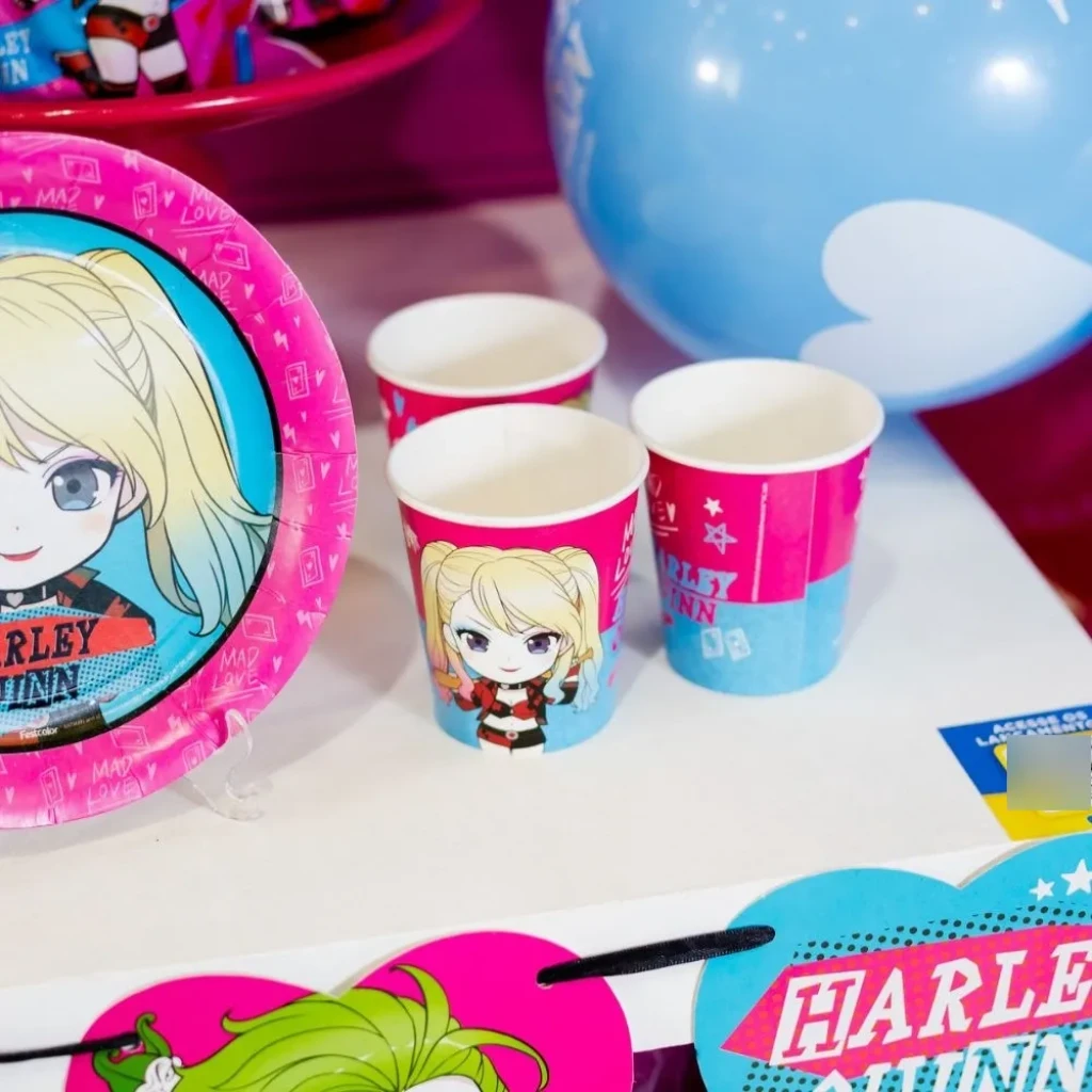 Todos os copos apresentam ilustrações do personagem Arlequina, trazendo um charme especial à mesa. Uma ótima dica é usá-los como lembrancinha, recheados com doces e embrulhados em plástico transparente!