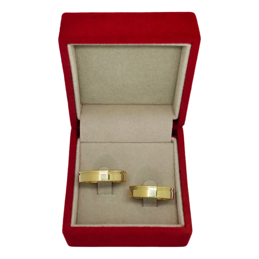 - Um par de alianças douradas FRISADAS, com 6mm de largura