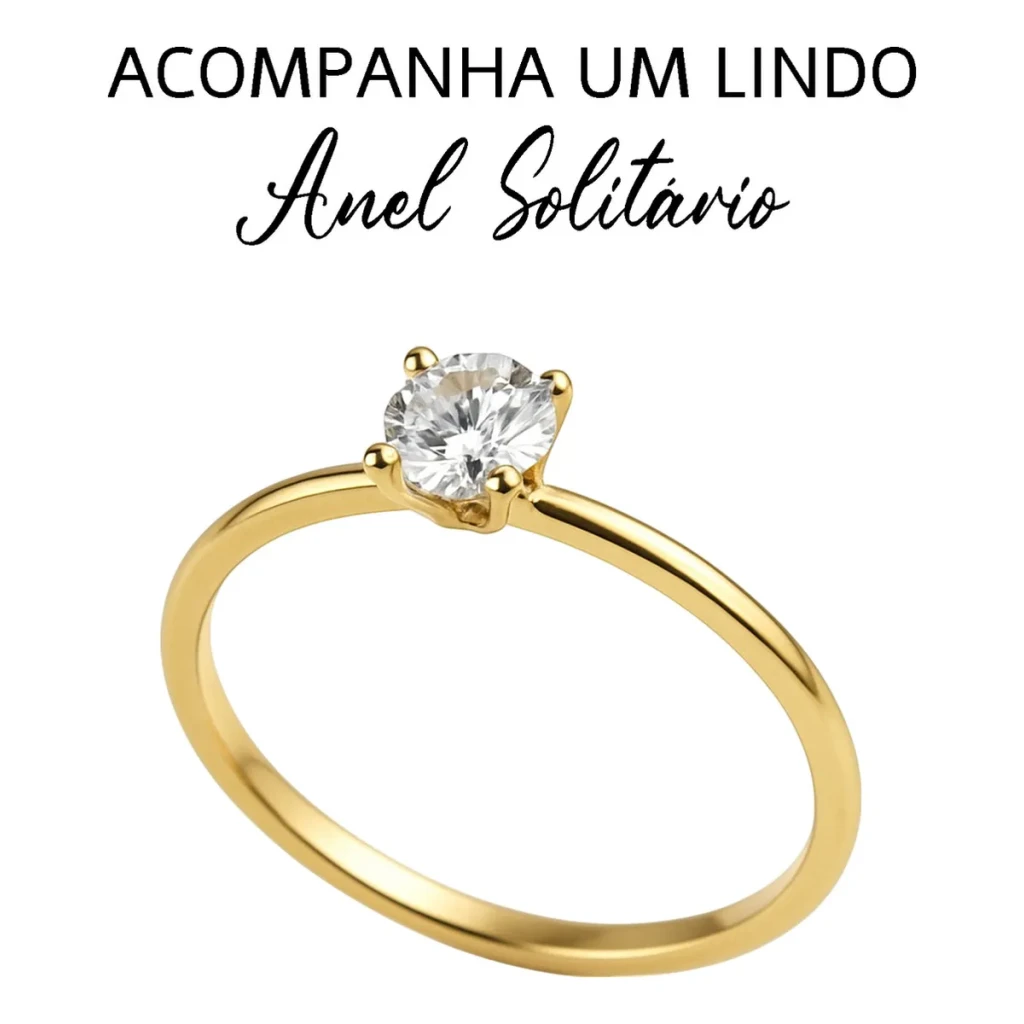 - Um anel solitário com pedra central brilhante, ideal para noivado ou compromisso