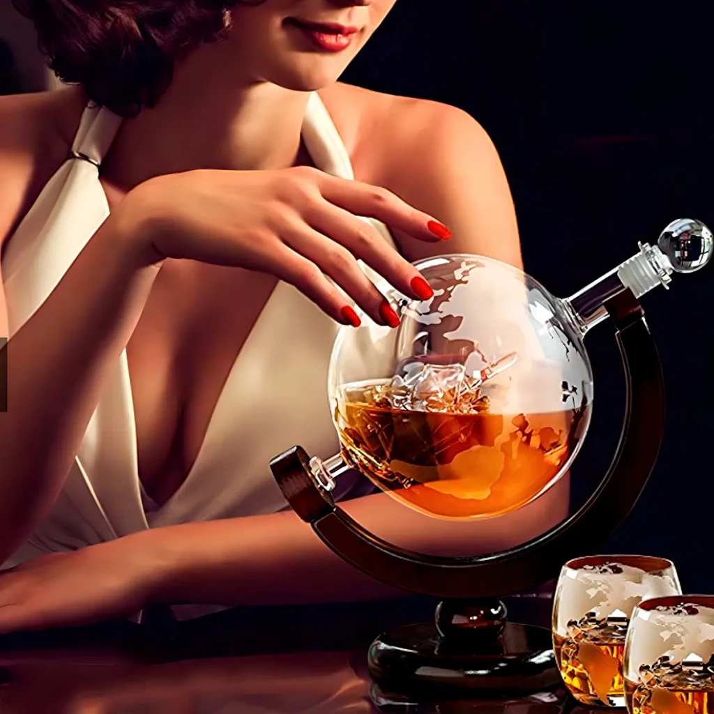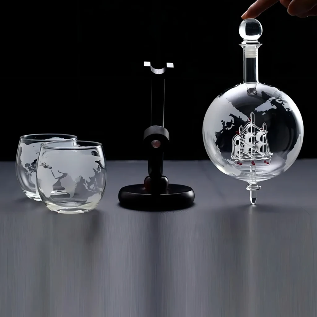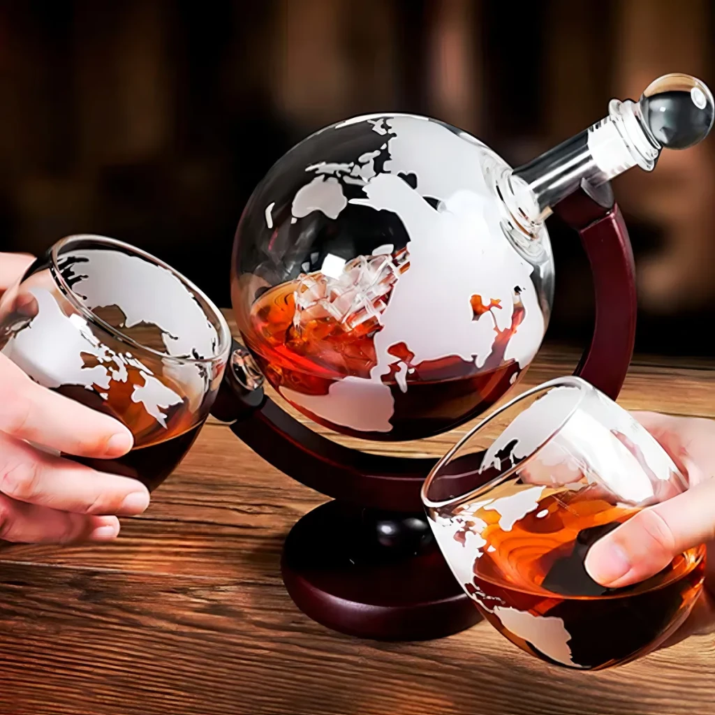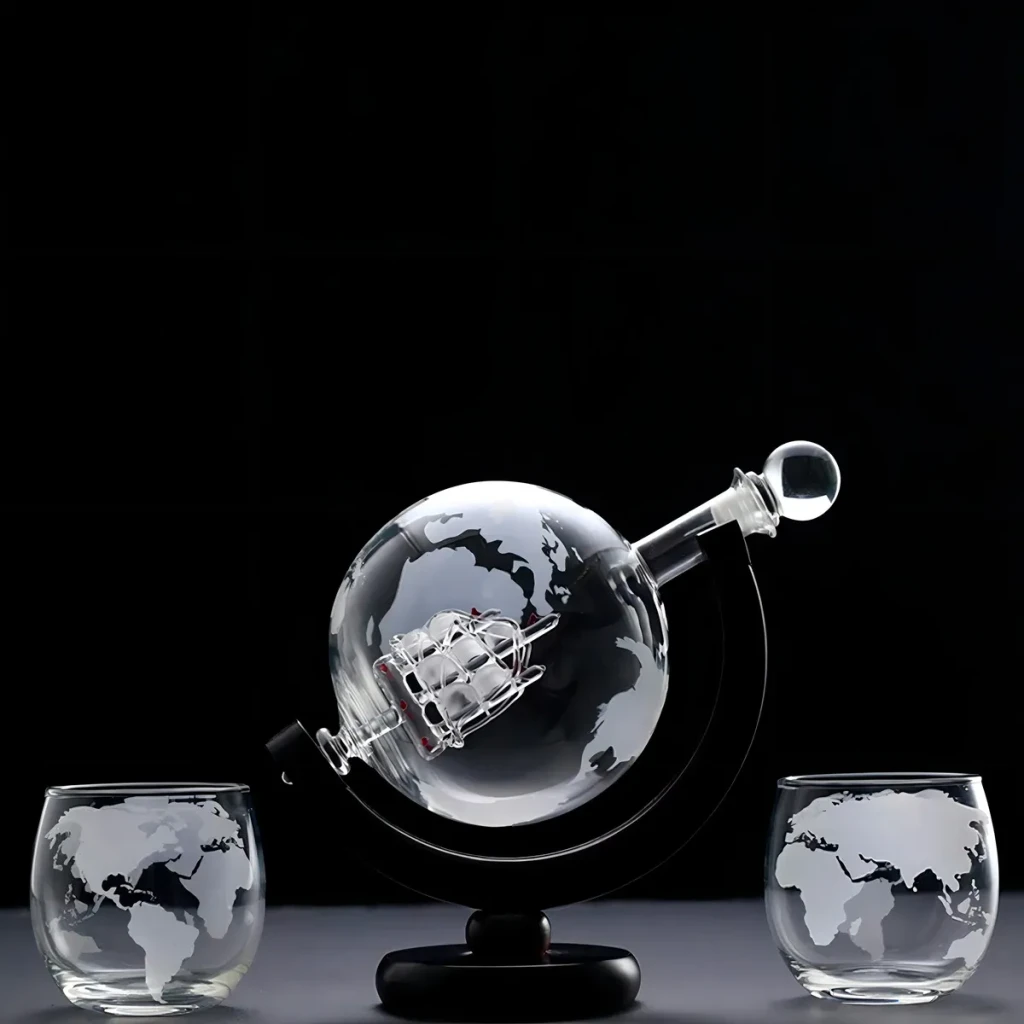 Transforme sua experiência de degustação com nosso conjunto de decantador de uísque inspirado no globo terrestre. Feito de vidro seguro, sem chumbo, este conjunto inclui dois copos gravados.