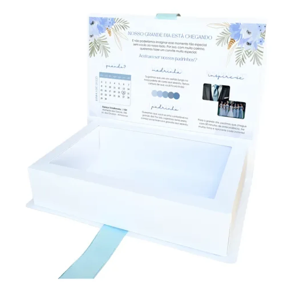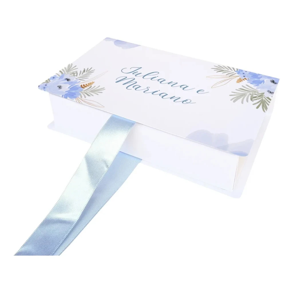 Apresentamos os convites 100% personalizados, ideais para diversas ocasiões, especialmente para o seu casamento. Cada caixa possui medidas aproximadas de 15cm x 9cm x 4cm e é confeccionada em papel offset 240g, com fita cetim de 15mm ou 22mm, garantindo um acabamento elegante.