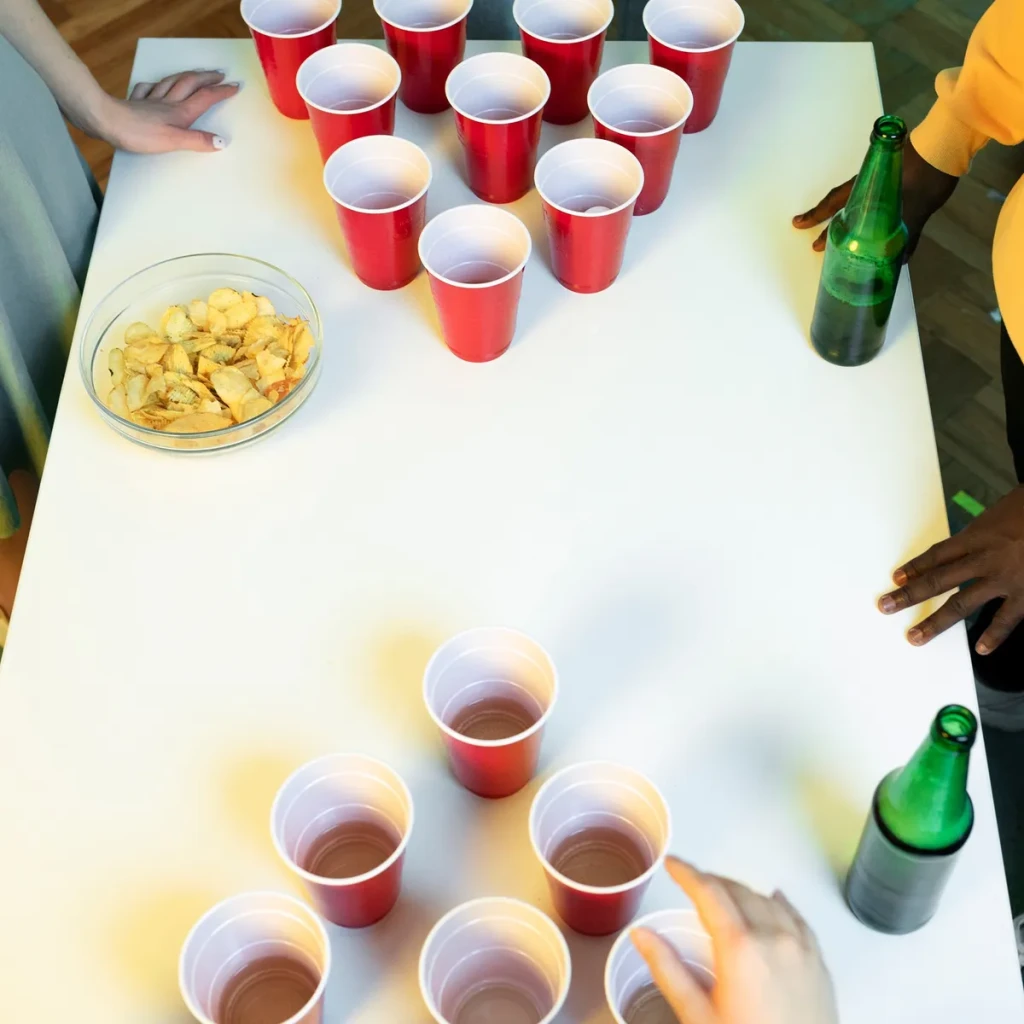 - Cada equipe tenta arremessar uma bola de ping pong nos copos adversários