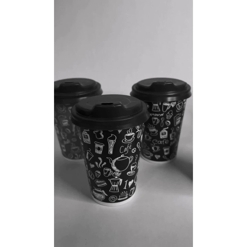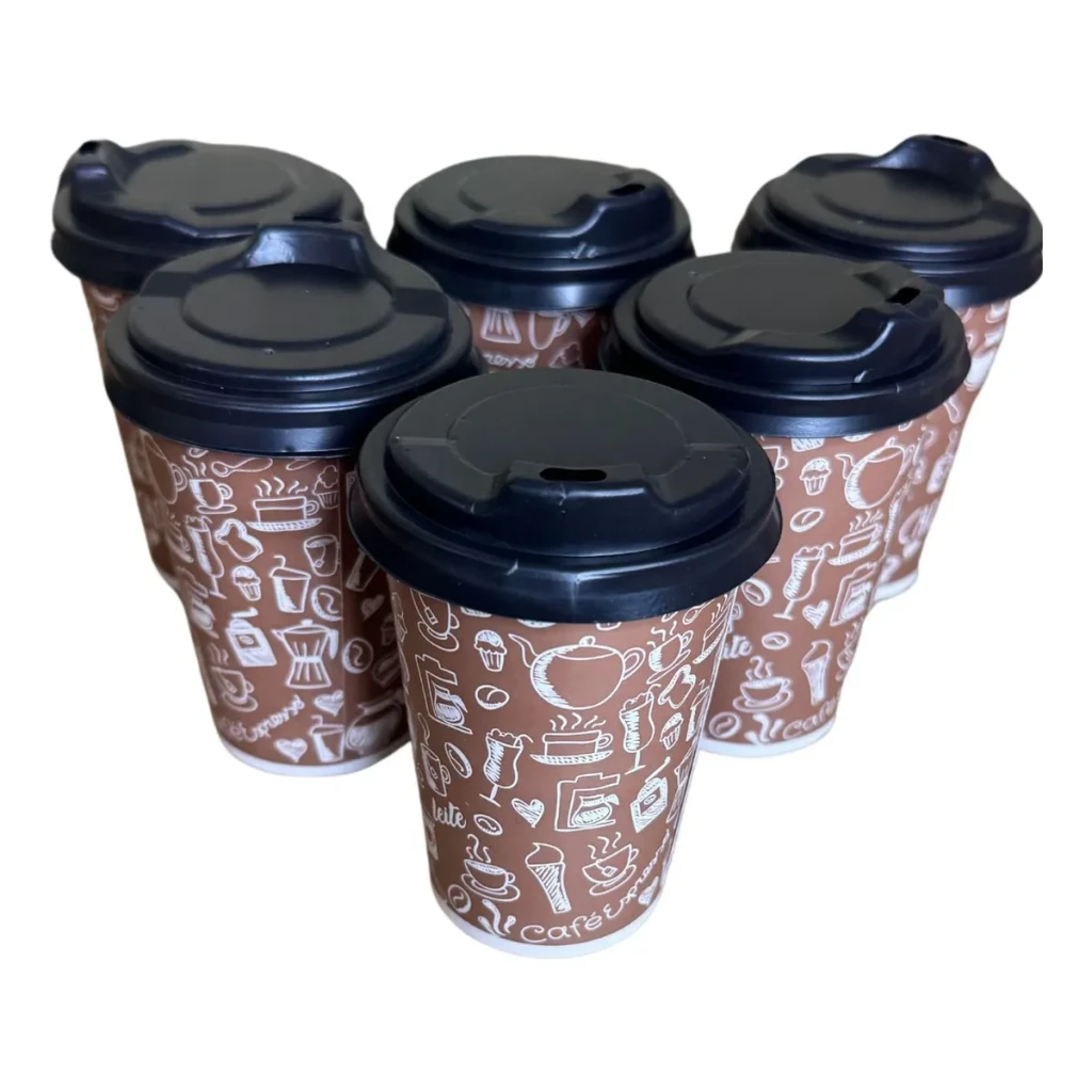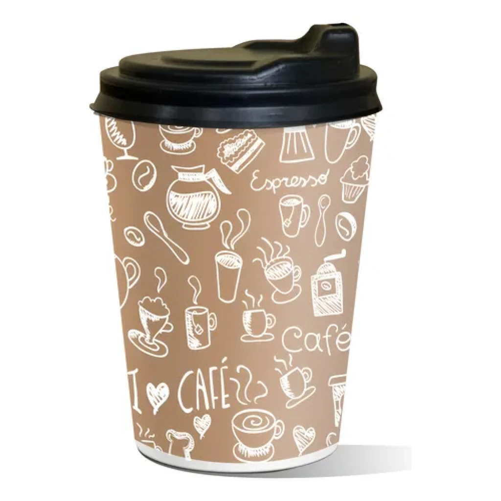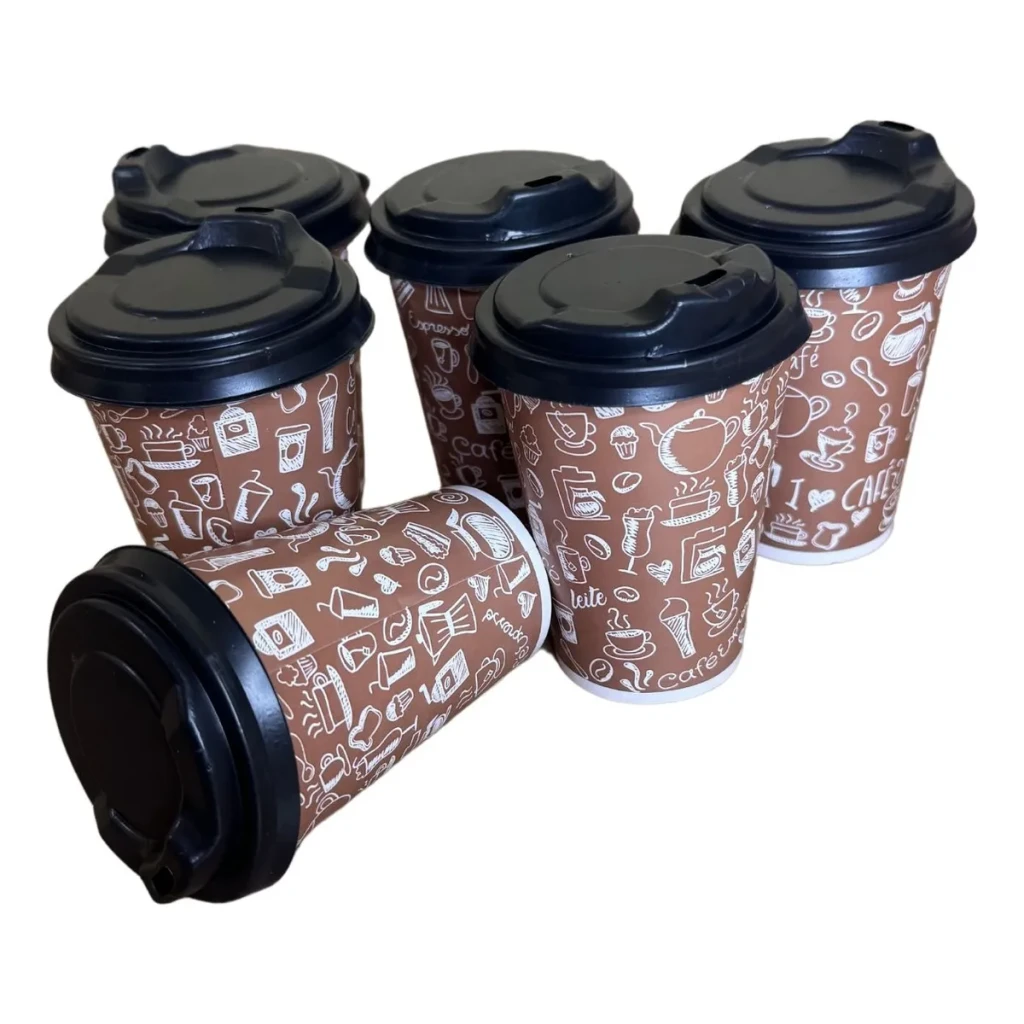 Os copos de papel de 180 ml são ideais para servir bebidas quentes ou frias de forma prática e higiênica. Com arte personalizada de café e tampa bico, eles oferecem conforto e estilo.