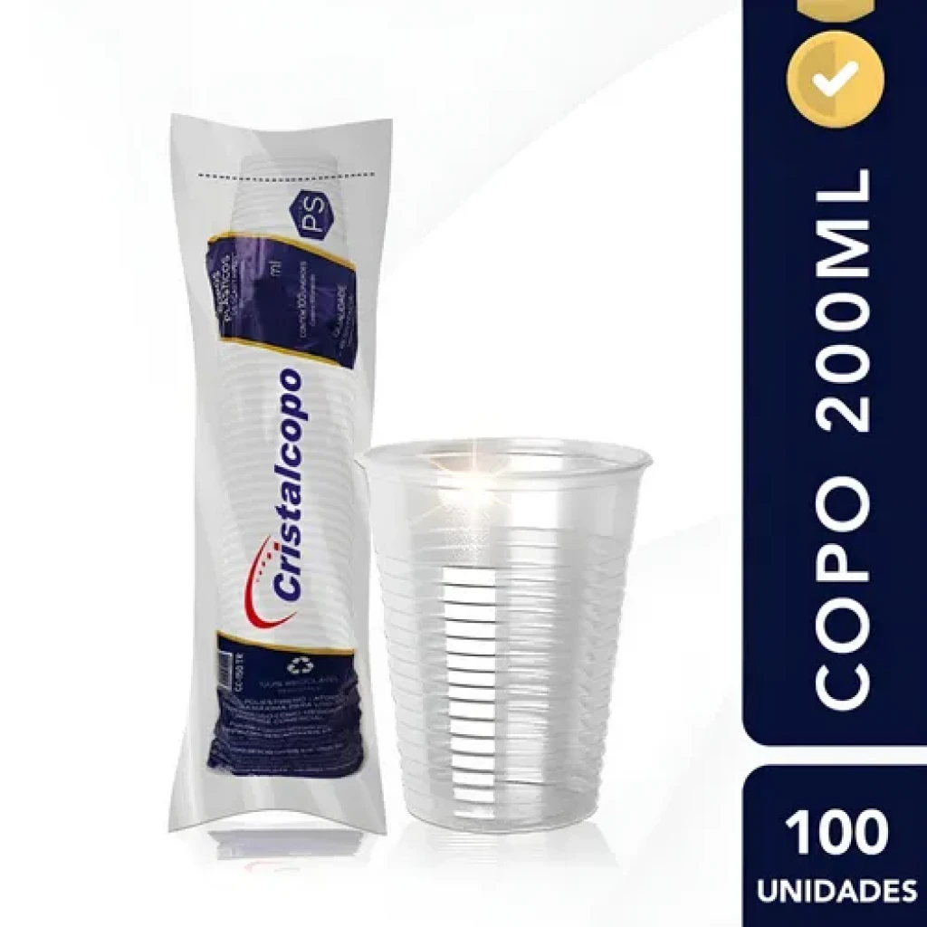 O Copo Plástico Descartável Transparente de 200ml é ideal para eventos e uso diário. Cada pacote contém 100 unidades de copos feitos em poliestireno, resistentes e atóxicos.
