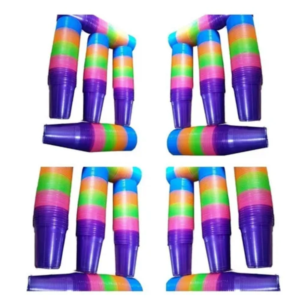 Transforme sua festa com os Copos Descartáveis Neon de 200ml! Este pacote contém 200 copos, divididos em 4 fardos de 50 copos em 5 cores vibrantes.