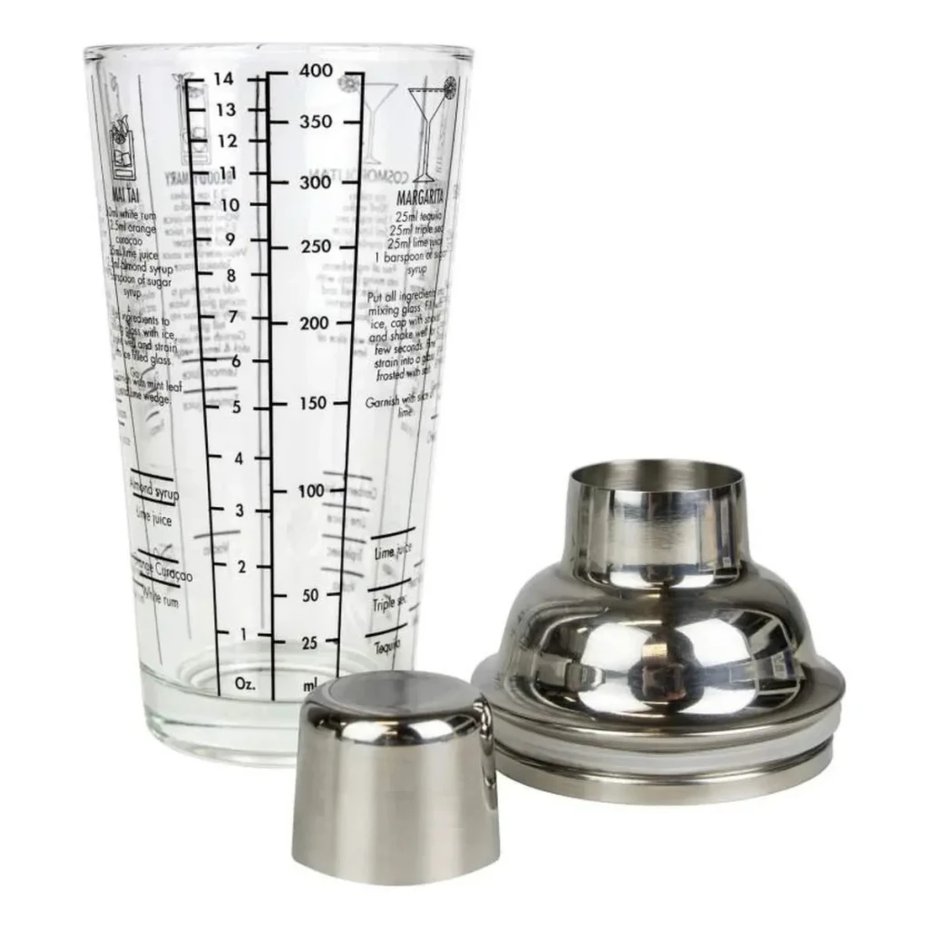 Eleve seu bar em casa com a Coqueteleira Profissional de 400ml. Feita de vidro resistente e tampa em aço inox, combina durabilidade e elegância.