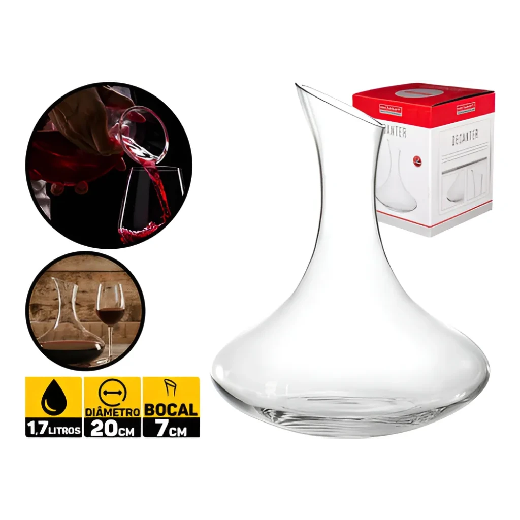 Descubra a excelência do vinho com o Decanter Aerador de Vinho Merlot, feito de vidro de alta qualidade. Sua capacidade de 1,7 litros e diâmetro de 20 cm são ideais para uma aeração perfeita.
