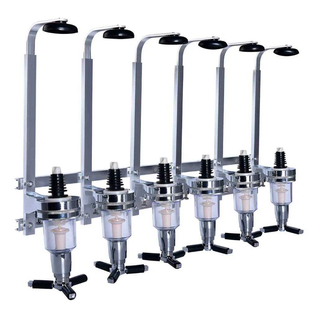 Maximize seu espaço com nosso dispenser de parede para 6 garrafas. Feito de alumínio durável, ele dispensa 45ml por acionamento, garantindo um serviço eficaz e elegante.