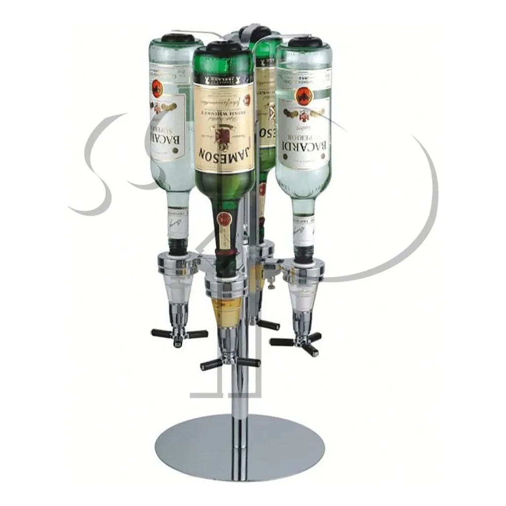 Transforme seu bar com este elegante suporte giratório para 4 garrafas. Ideal para bebidas variadas, facilita o acesso com bicos anti-vazamento e design compacto.