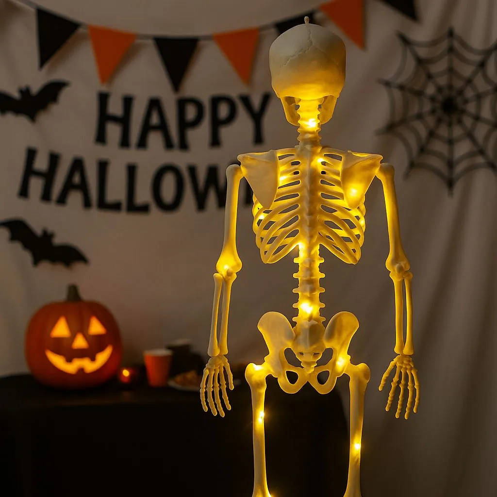 Esqueleto articulado de 70 cm com caveira iluminada por LED. Leve, resistente e fotogênico — destaque instantâneo para entrada, mesa e cenários temáticos.
