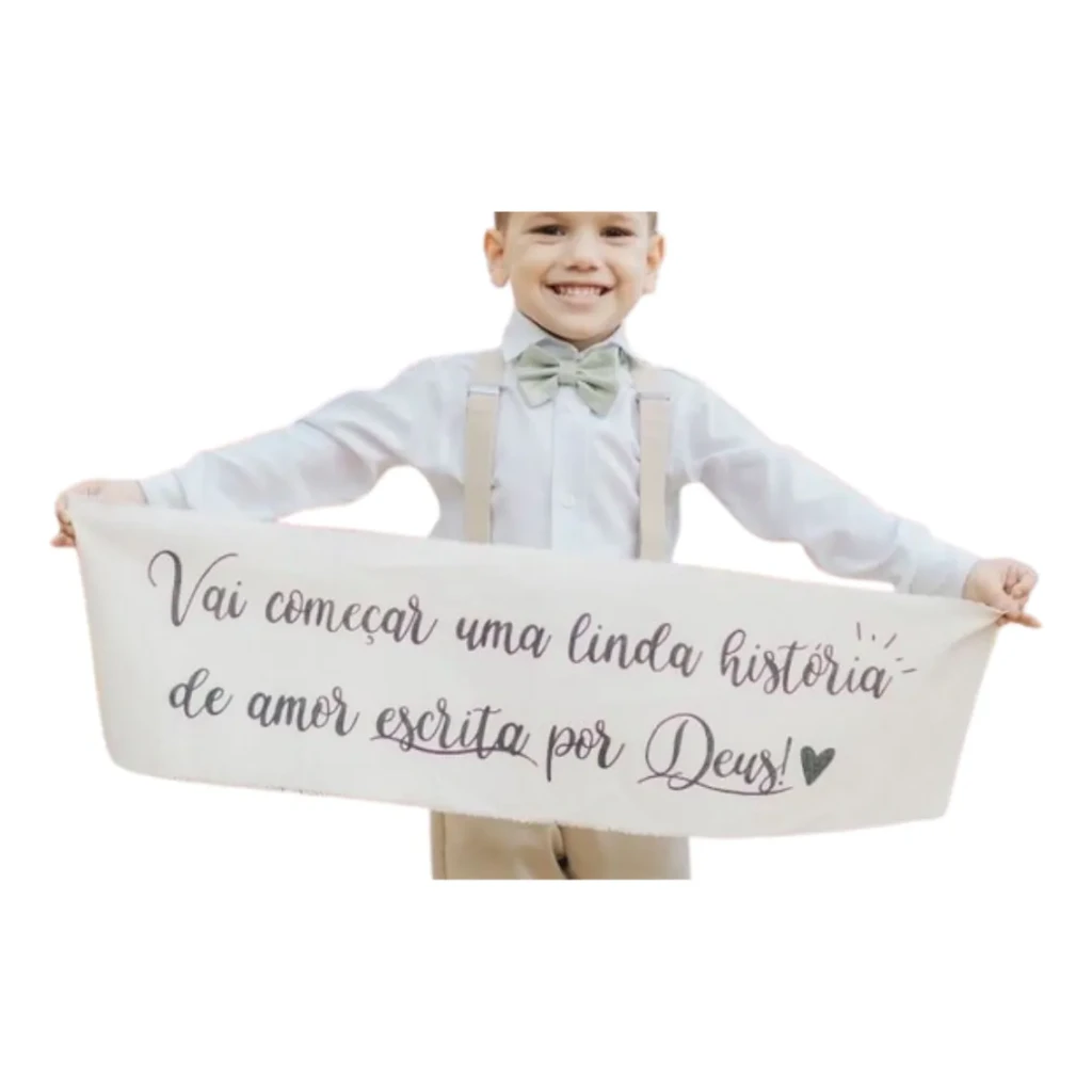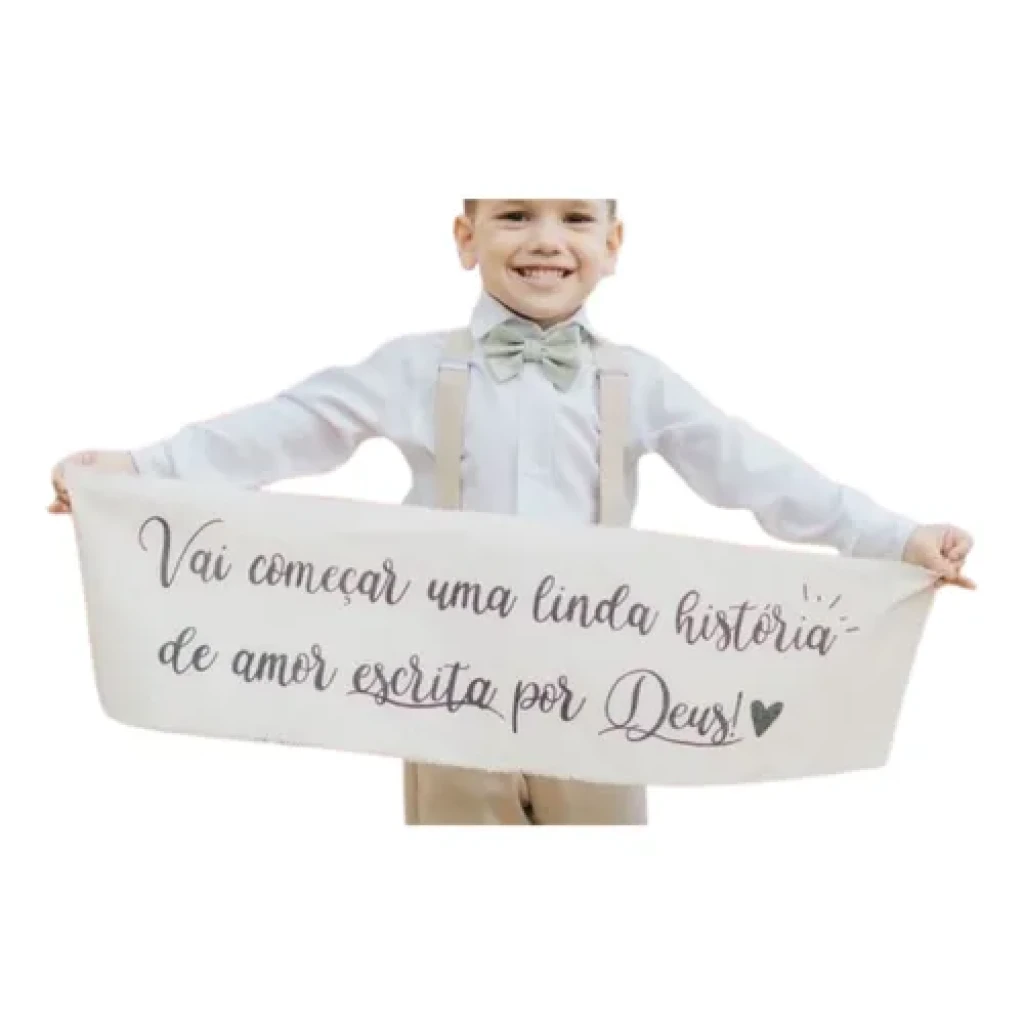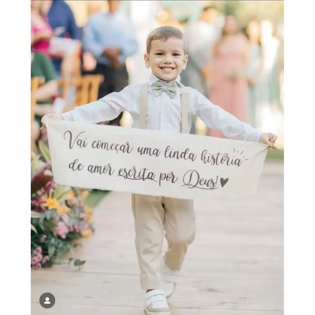 Esta faixa em tecido de algodão crú é ideal para ser usada na entrada da dama de honra, adicionando um charme especial ao seu casamento. A personalização feita à mão garante que cada faixa seja única, tornando-a perfeita para ocasiões especiais.