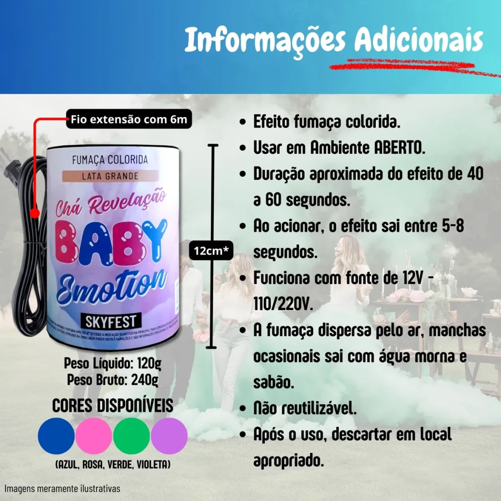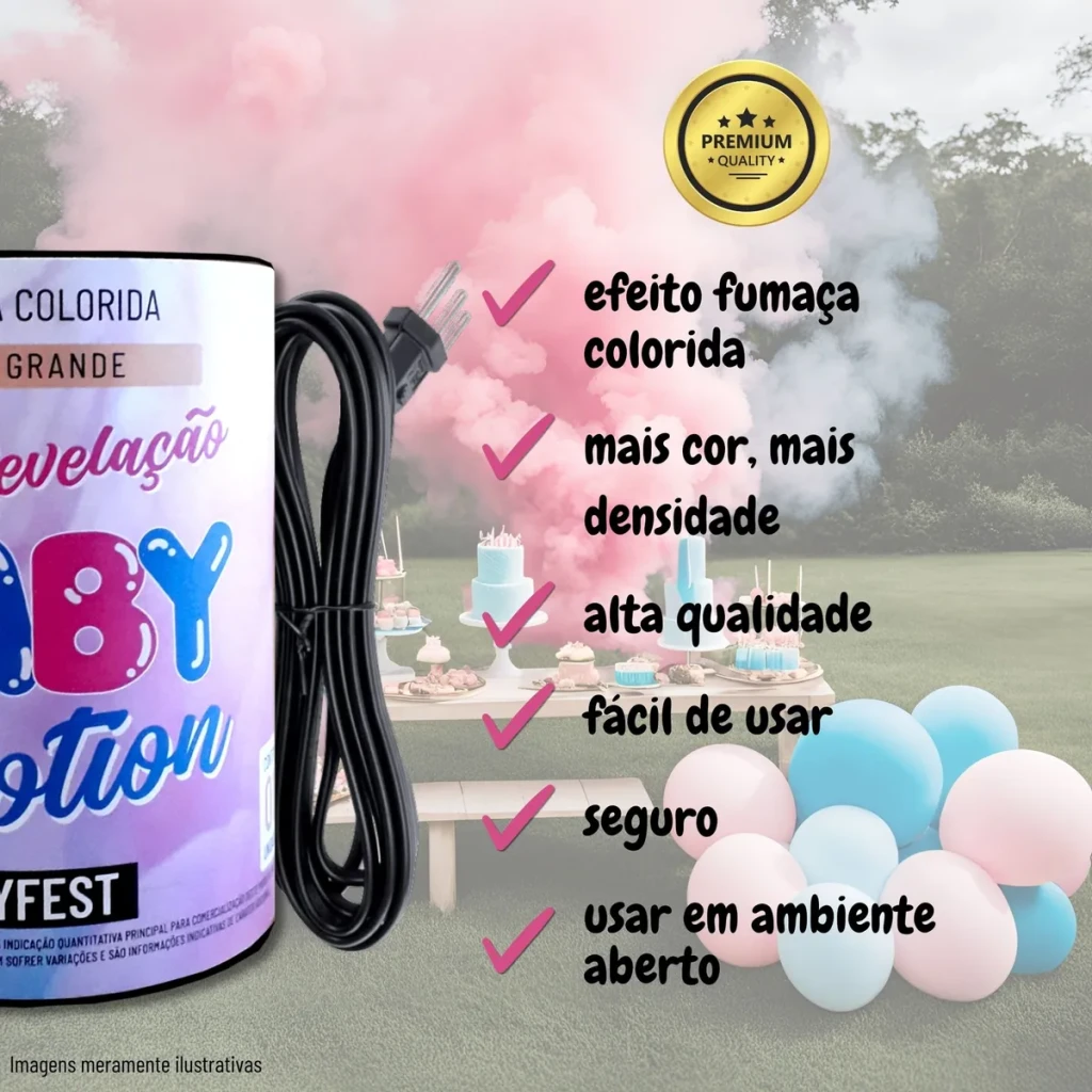 Transforme seu chá de revelação em um momento mágico com a Super Fumaça Colorida Baby Emotion. Com acionamento elétrico, é fácil de usar e garante um efeito visual deslumbrante.