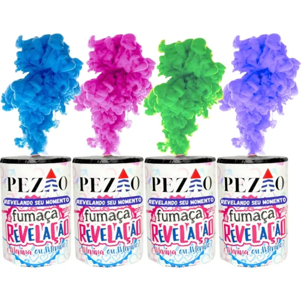 Com a Fumaça Revelação Super Fogos, você recebe uma lata de 75mm que produz intensa fumaça nas cores azul, rosa, verde e lilás. Cada unidade possui uma etiqueta indicando a cor escolhida.