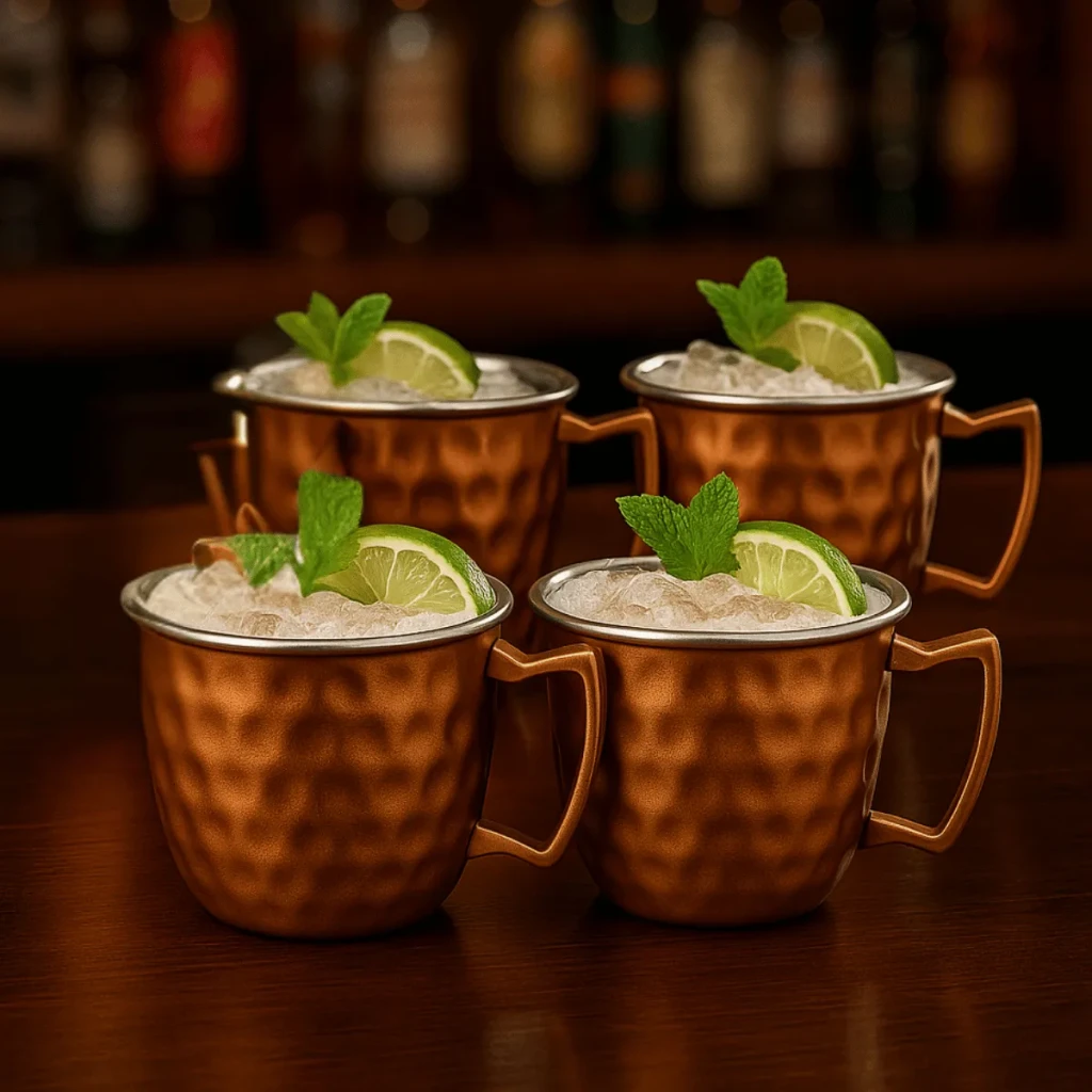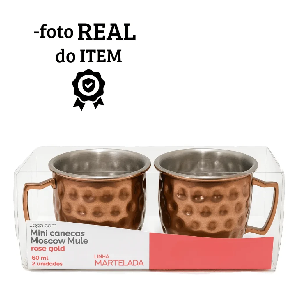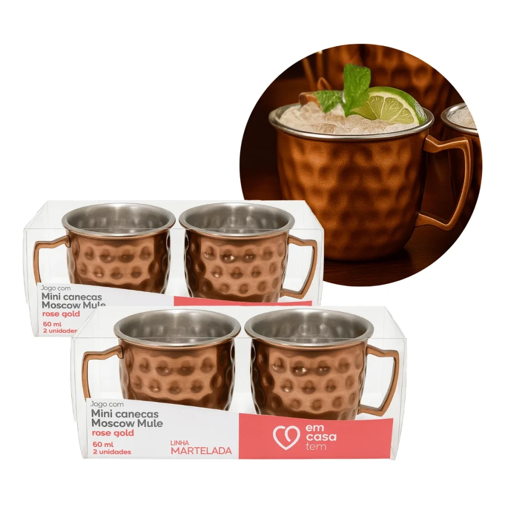 Descubra o Jogo com 4 Canecas Moscow Mule Marteladas em Rosé Gold, perfeitas para servir drinks com estilo. Cada caneca tem capacidade de 60ml e um design elegante.