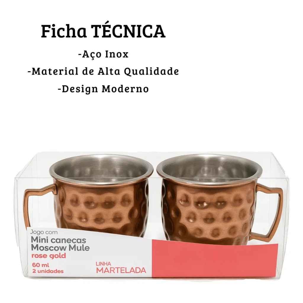 O Jogo de Canecas Moscow Mule Marteladas Rosé Gold é a escolha perfeita para quem aprecia bebidas servidas com charme e originalidade. Com um acabamento martelado e a elegante cor rosé gold, essas canecas são feitas de aço inox, combinando resistência e estilo.