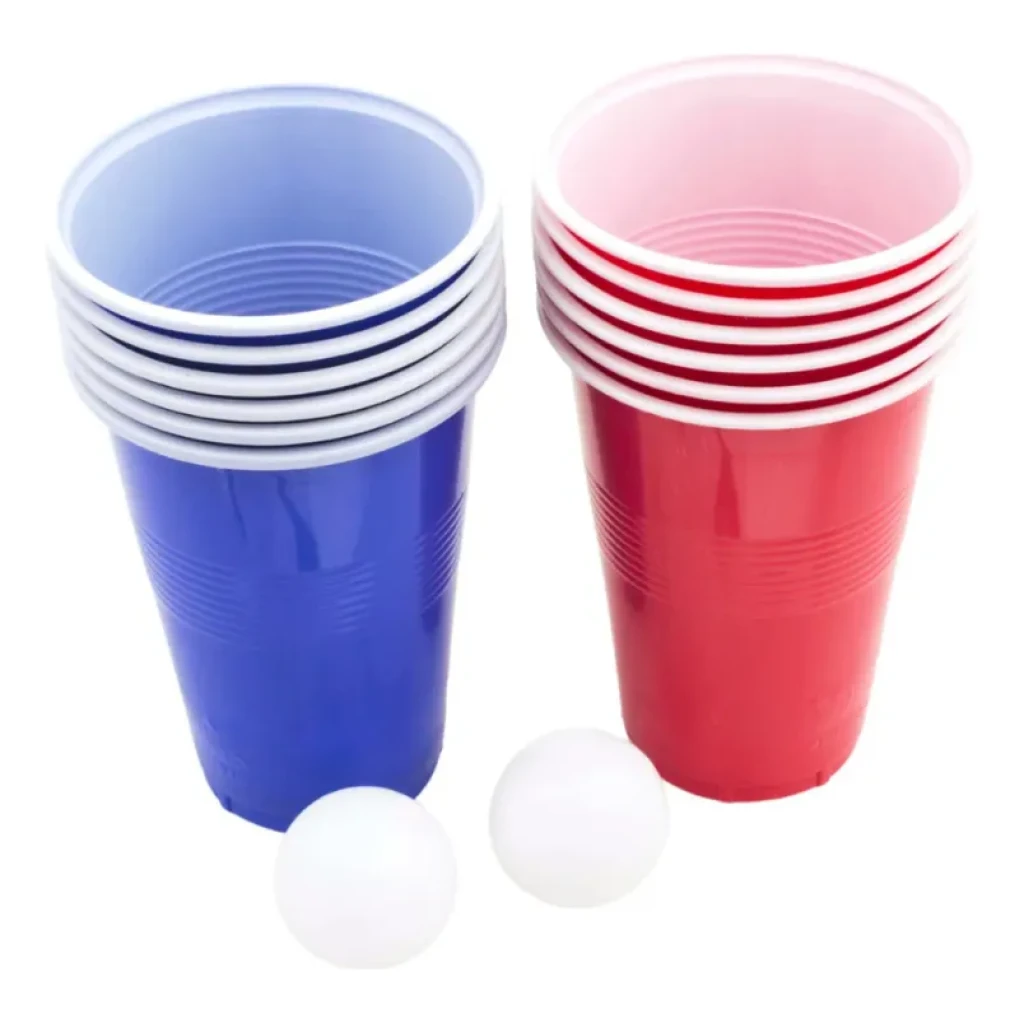 - Conteúdo da embalagem: 12 copos (6 vermelhos e 6 azuis) e 2 bolinhas