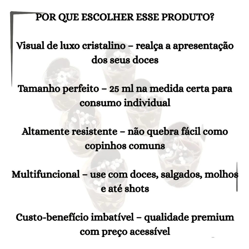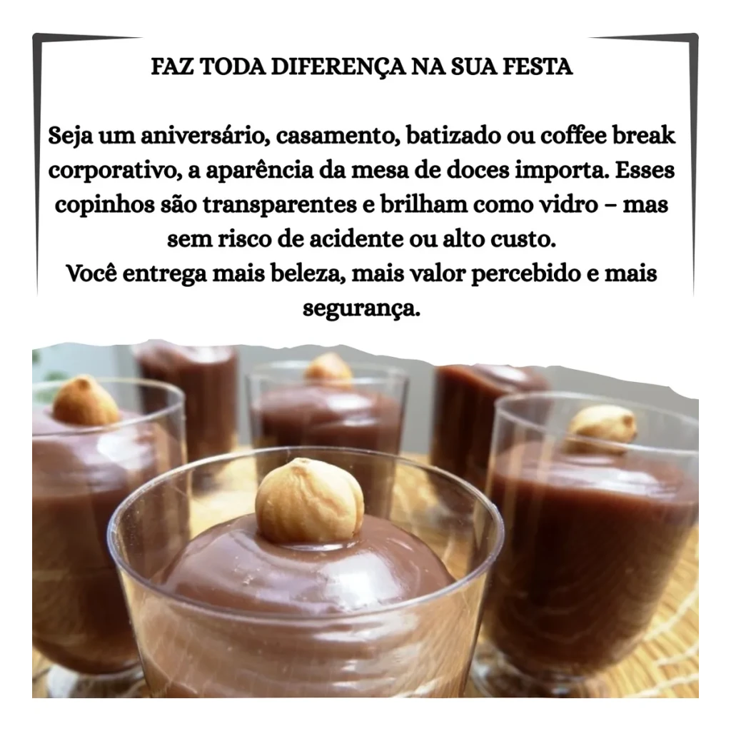 Seja em aniversários, casamentos ou eventos corporativos, a aparência da mesa de doces importa. Esses copinhos transparentes brilham como vidro, mas são seguros e acessíveis.