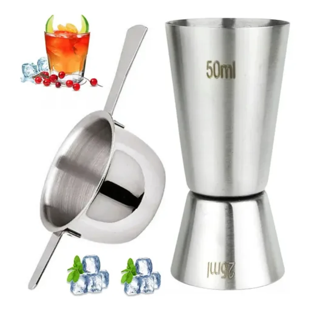 Transforme sua experiência de coquetelaria com este kit de dosadores em aço inox. Inclui um dosador duplo de 25/50ml e um dosador de 50ml, perfeitos para medir com precisão.