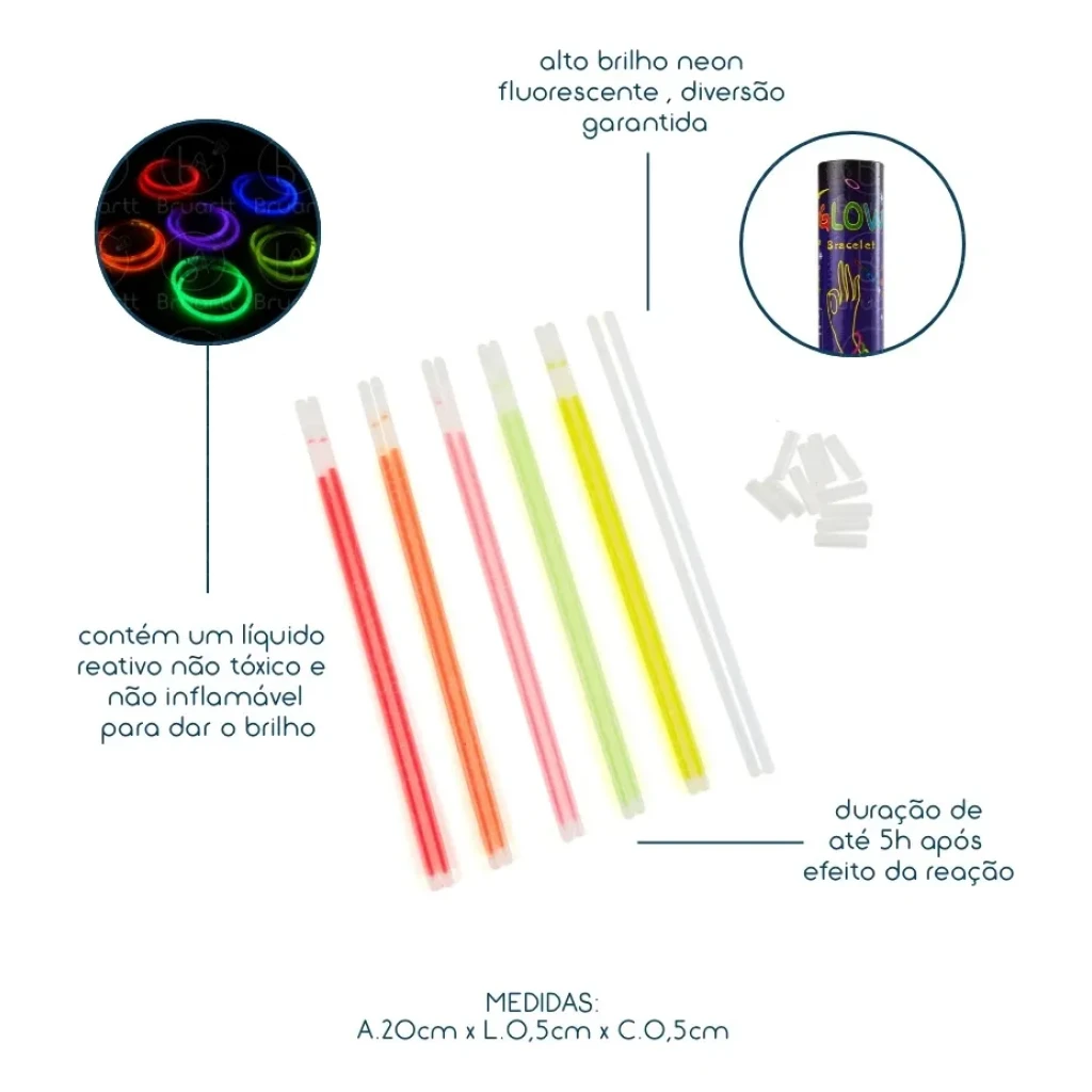 - Variedade de Cores: Inclui uma ampla gama de cores neon que se destacam à noite, perfeitas para qualquer ocasião.