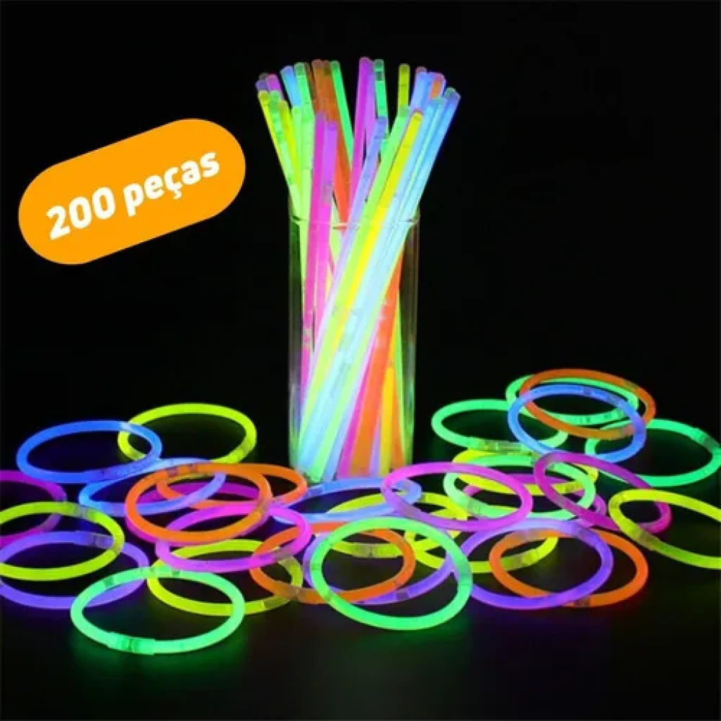 Ilumine suas festas com o Kit 200 Pulseiras Neon! Com brilho fluorescente LED, elas são perfeitas para criar um ambiente vibrante e festivo.