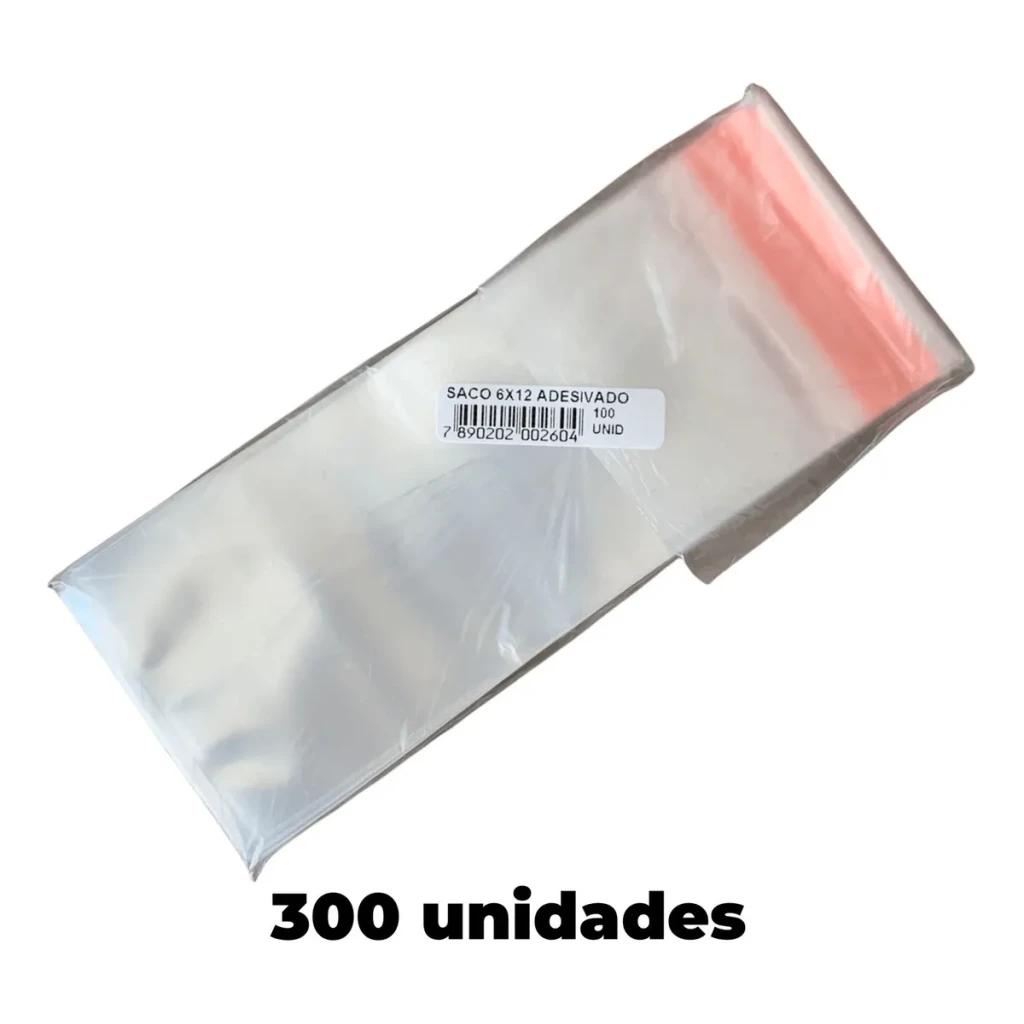 300 unidades de saco plástico com aba adesivada.