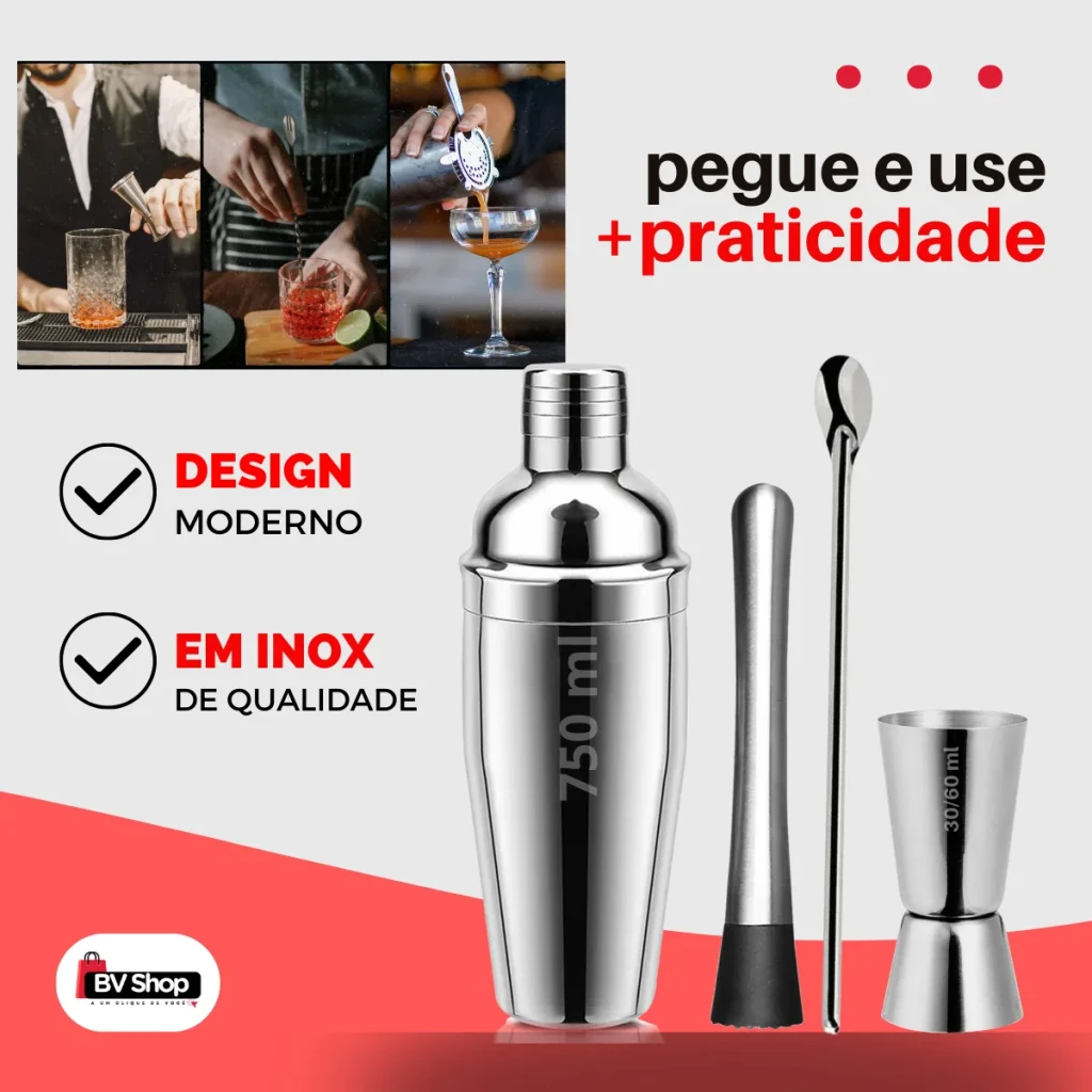 Inclui coqueteleira de 750ml, dosador, socador e colher bailarina. Impressione seus convidados com drinks saborosos e apresentação impecável.