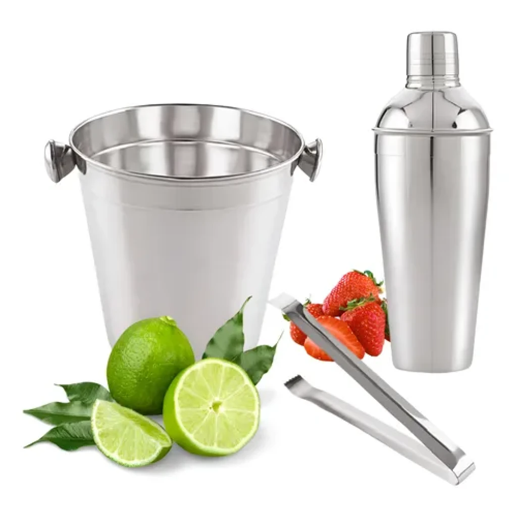 Transforme-se em um bartender profissional com nosso Kit Bar Inox de 3 peças. Inclui balde, pegador e coqueteleira para preparar drinks incríveis.