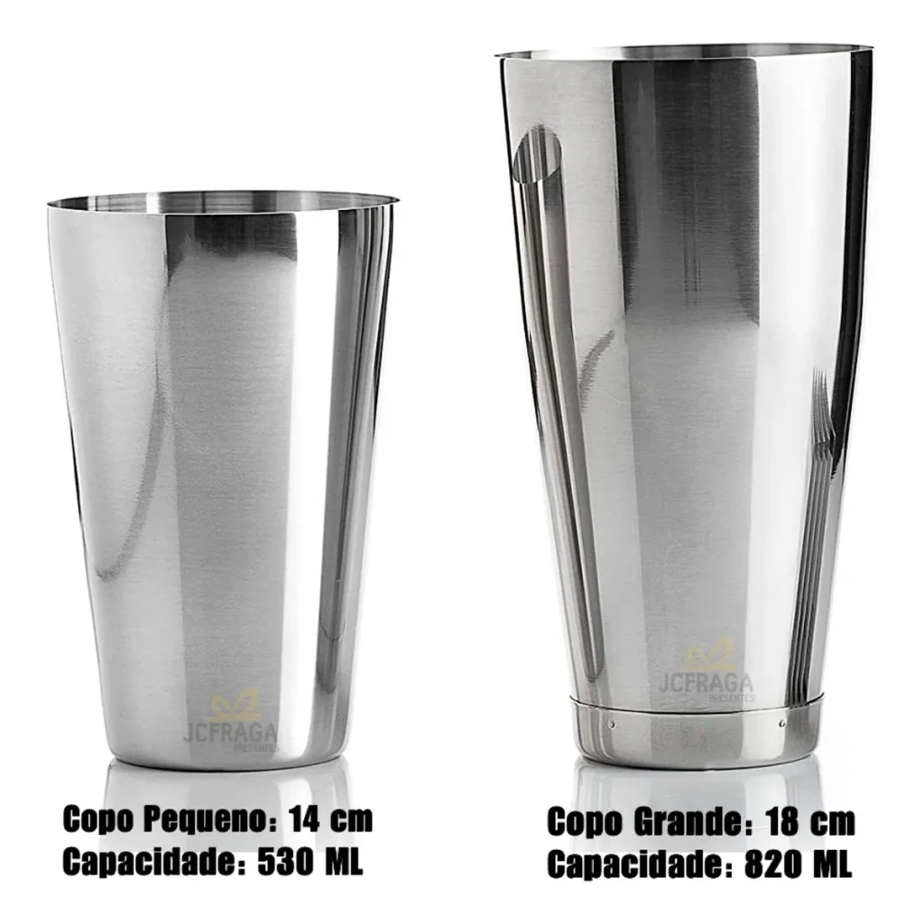 - Coqueteleira Profissional Boston: 820 ml copo maior / 530 ml copo menor