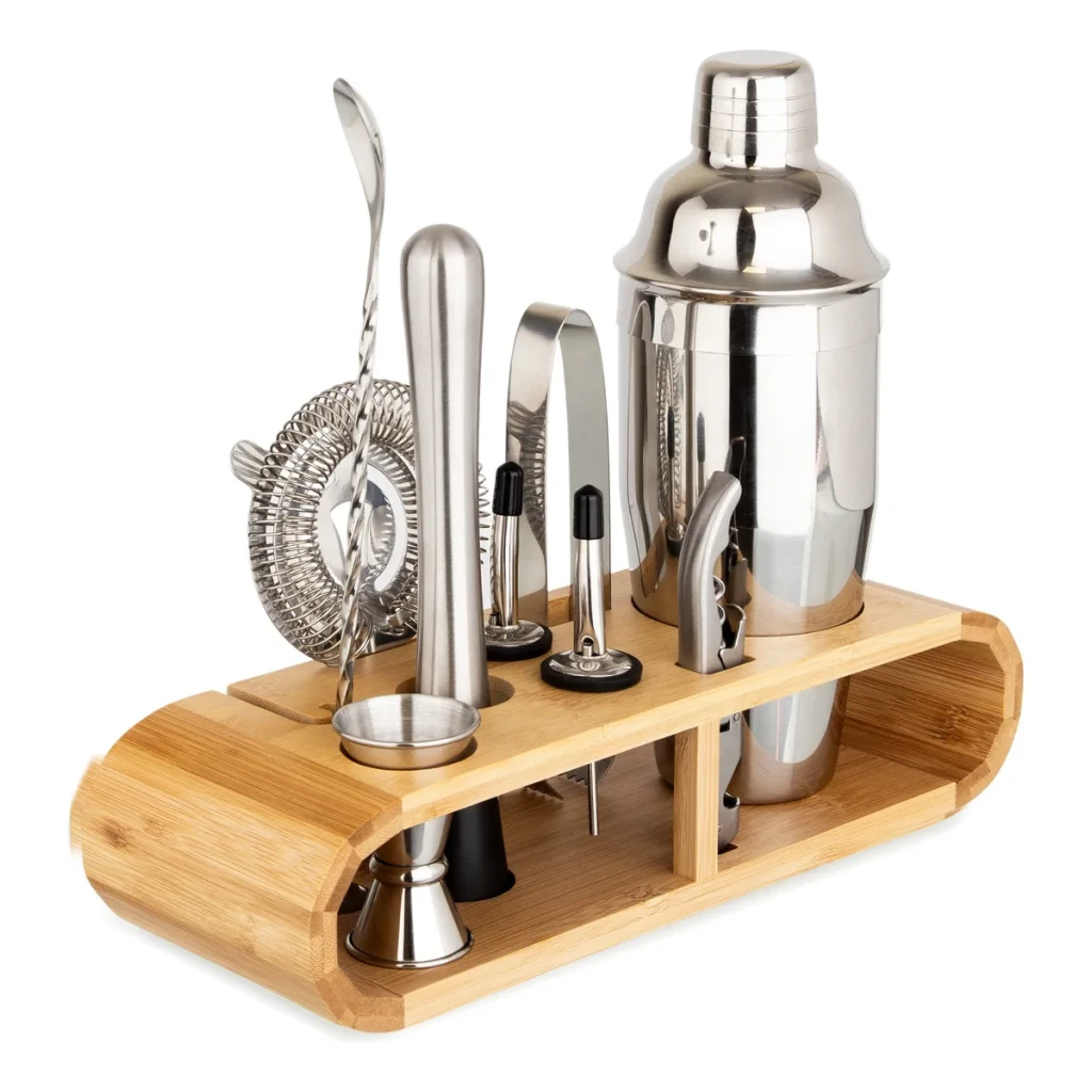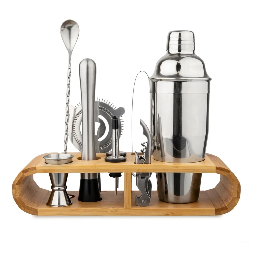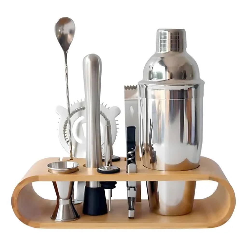 O suporte de bambu oferece organização e um toque decorativo à sua cozinha. Com itens como jigger duplo, coador e saca-rolhas, este kit é ideal para quem deseja impressionar com coquetéis de qualidade.