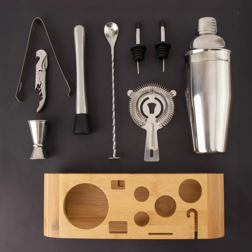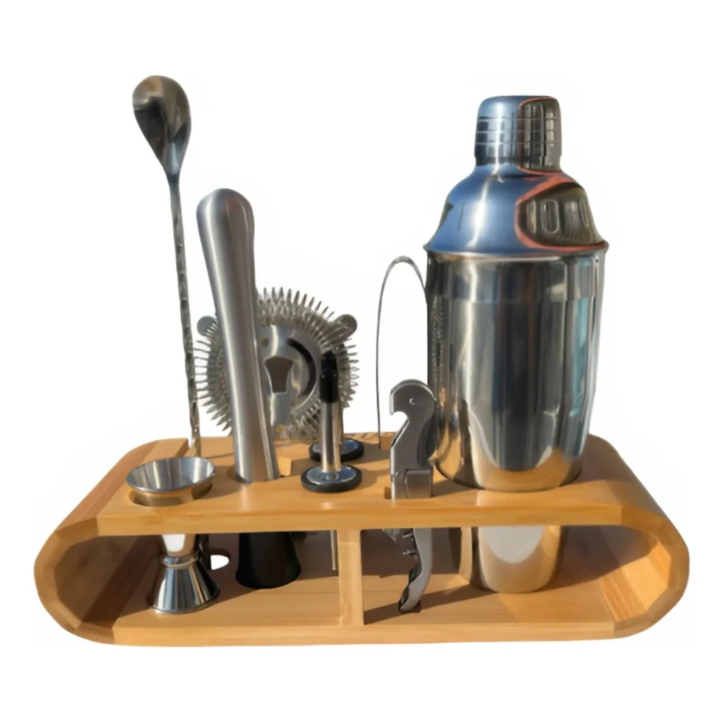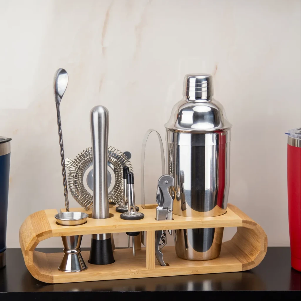 O suporte de bambu oferece organização e um toque decorativo à sua cozinha. Com itens como jigger duplo, coador e saca-rolhas, este kit é ideal para quem deseja impressionar com coquetéis de qualidade.