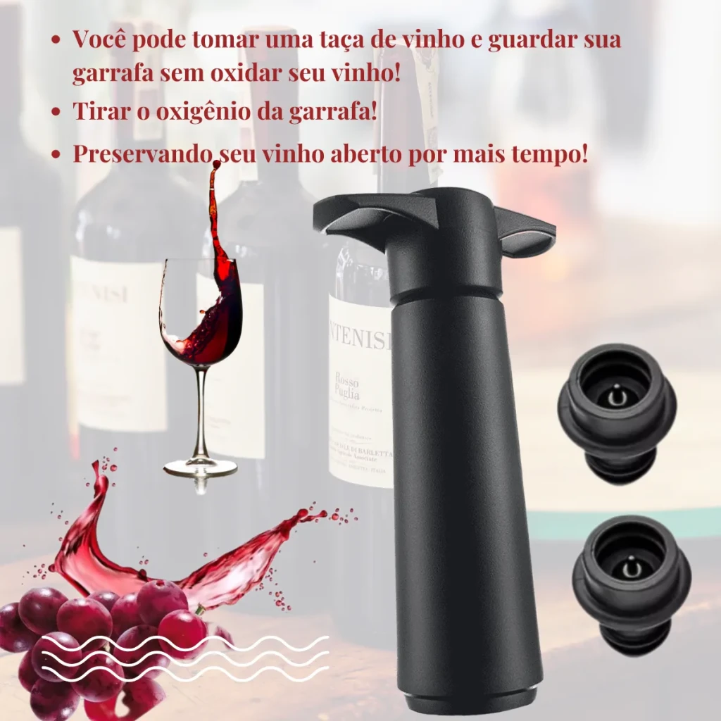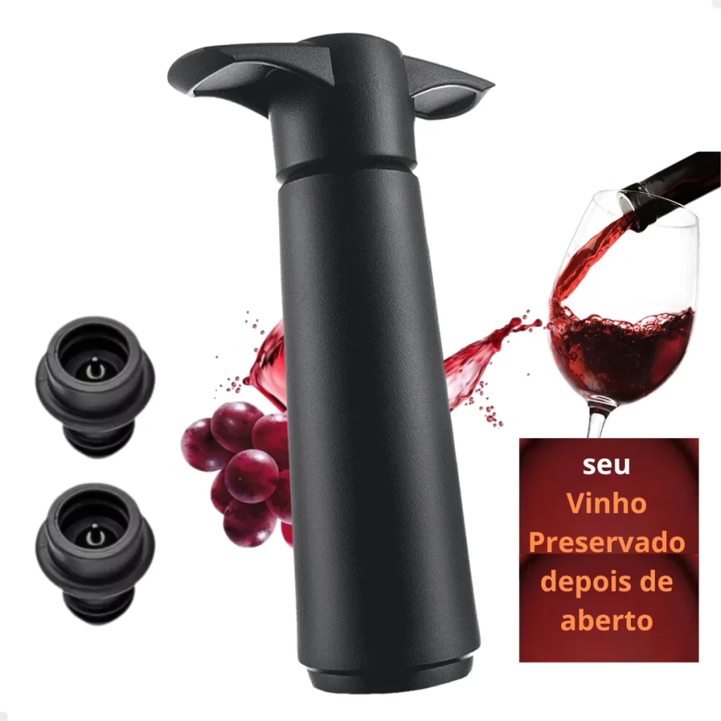 Mantenha seu vinho fresco e saboroso com nosso Kit Bomba a Vácuo para Vinho, um acessório inovador e imprescindível para os amantes do vinho.