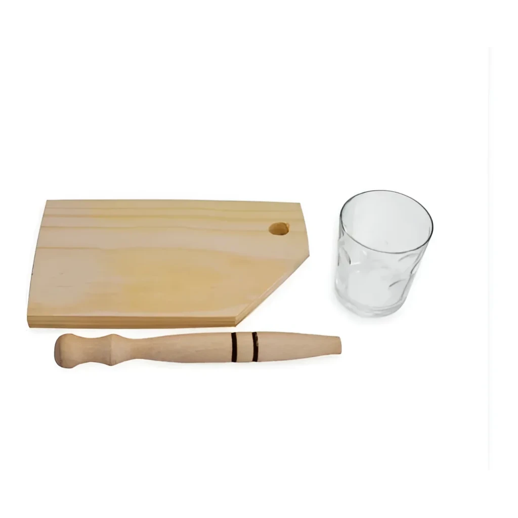Desfrute da arte de fazer caipirinhas com este kit exclusivo, composto por peças essenciais: copo de vidro, mini tábua e um socador de qualidade.