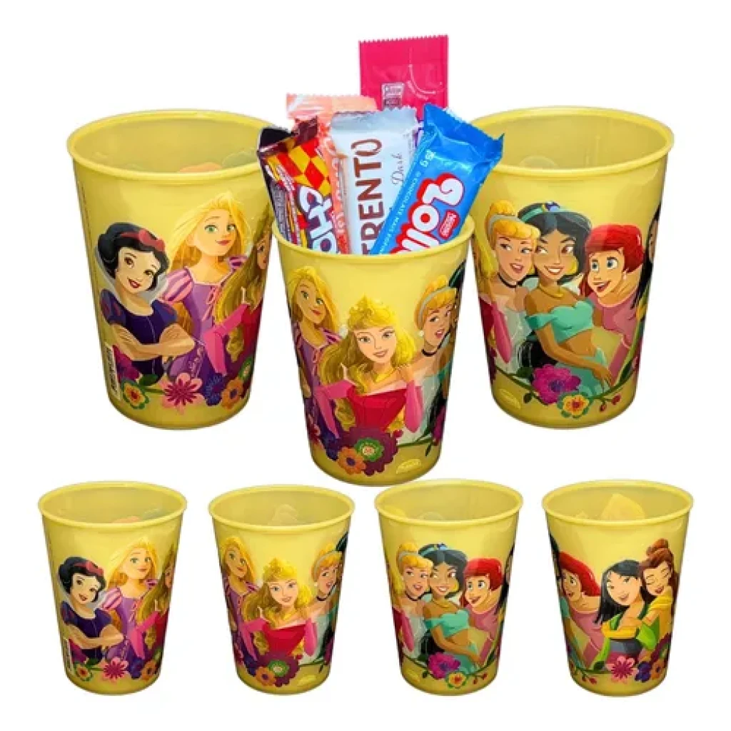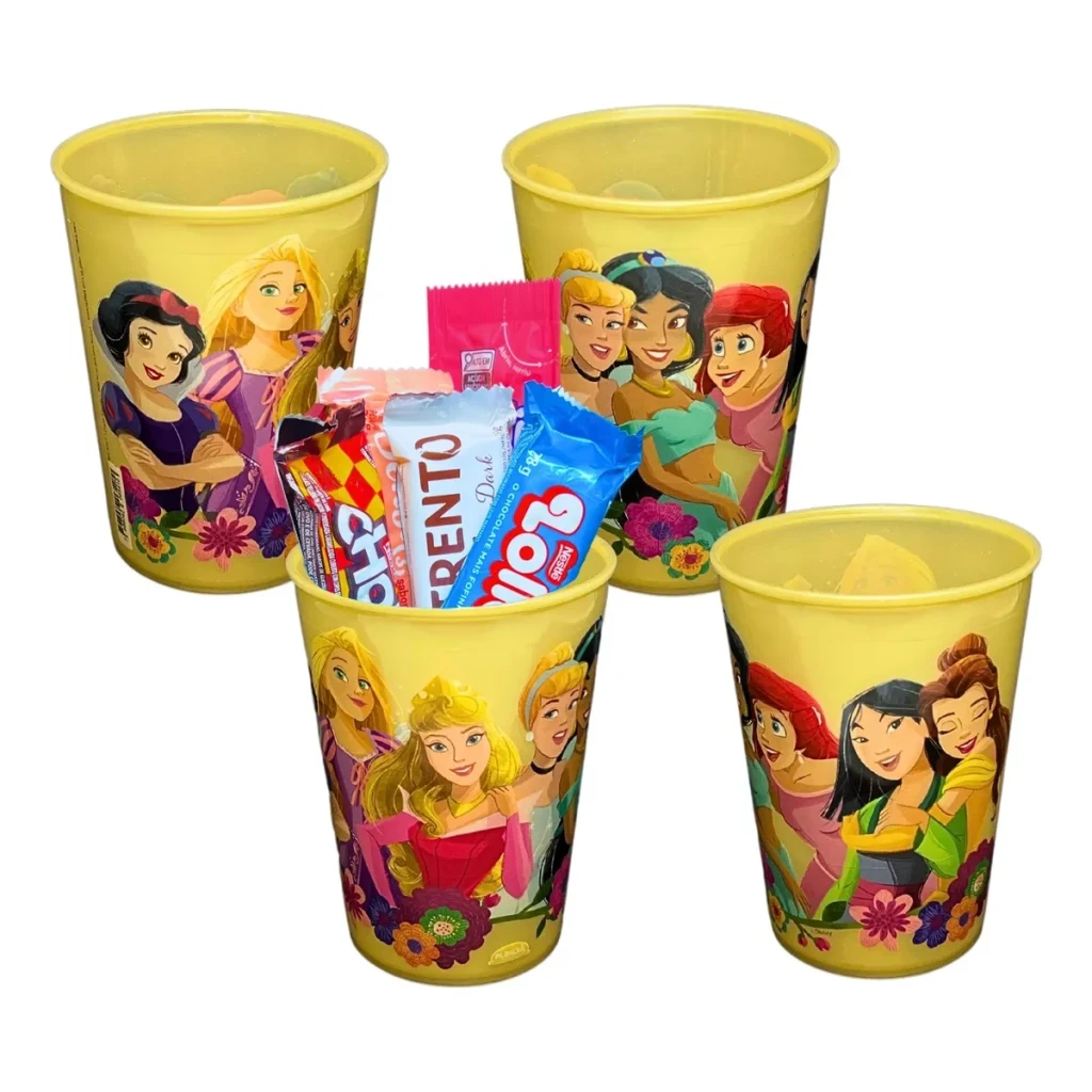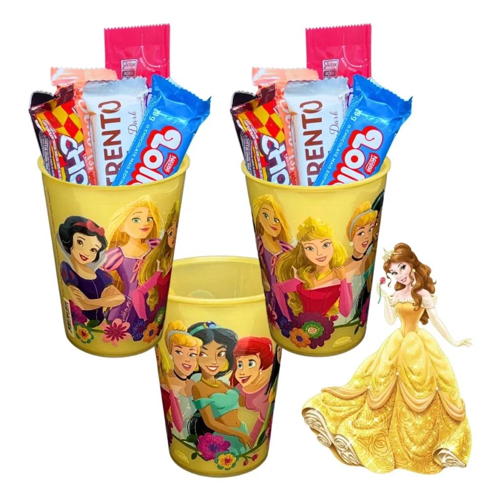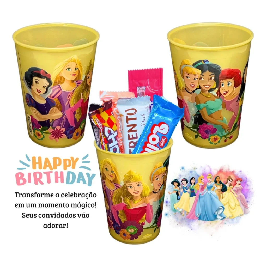 Os copos apresentam estampas sortidas das princesas mais amadas, como Branca de Neve, Cinderela e Ariel, trazendo magia e diversão para a sua comemoração.