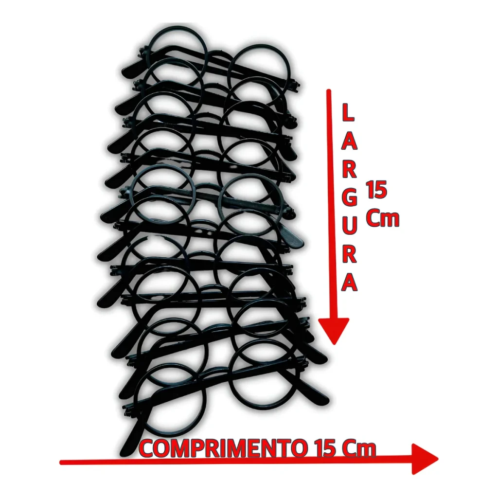 Este kit contém 10 óculos pretos estilosos, perfeitos para festas temáticas, eventos ou para adicionar um toque especial ao seu dia a dia.